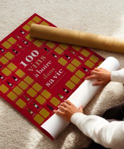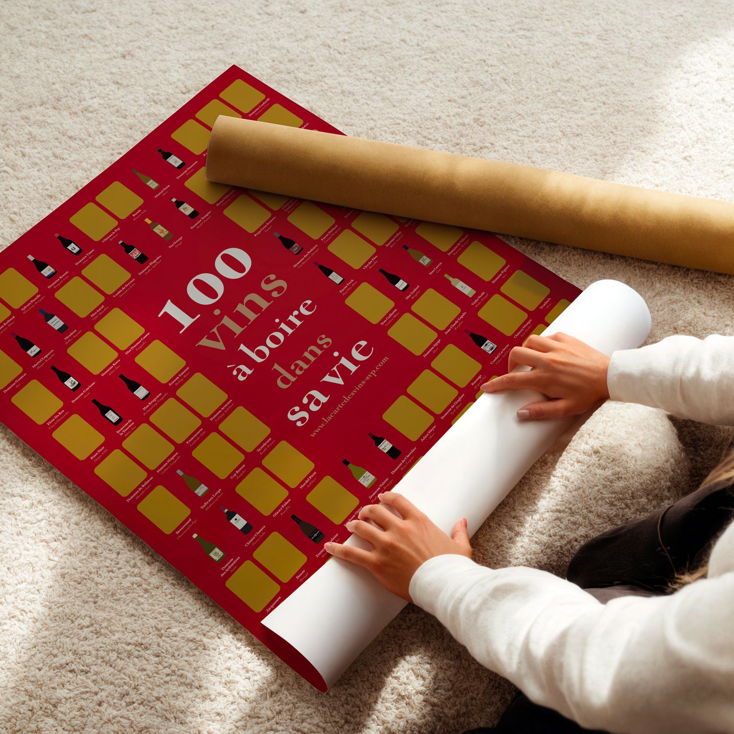 Une affiche unique qui liste 100 vins incontournables. Une fois que vous avez dégusté le vin mentionné, vous grattez la case et passez au suivant.
