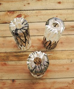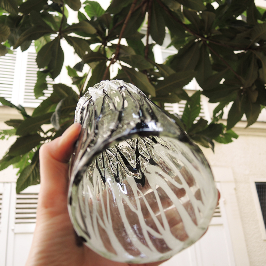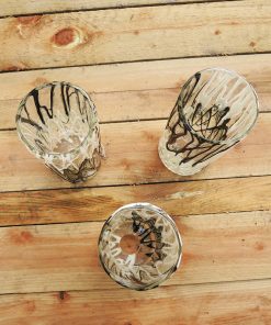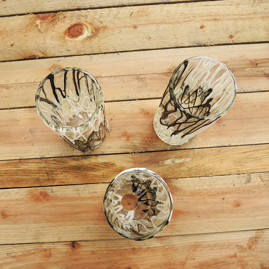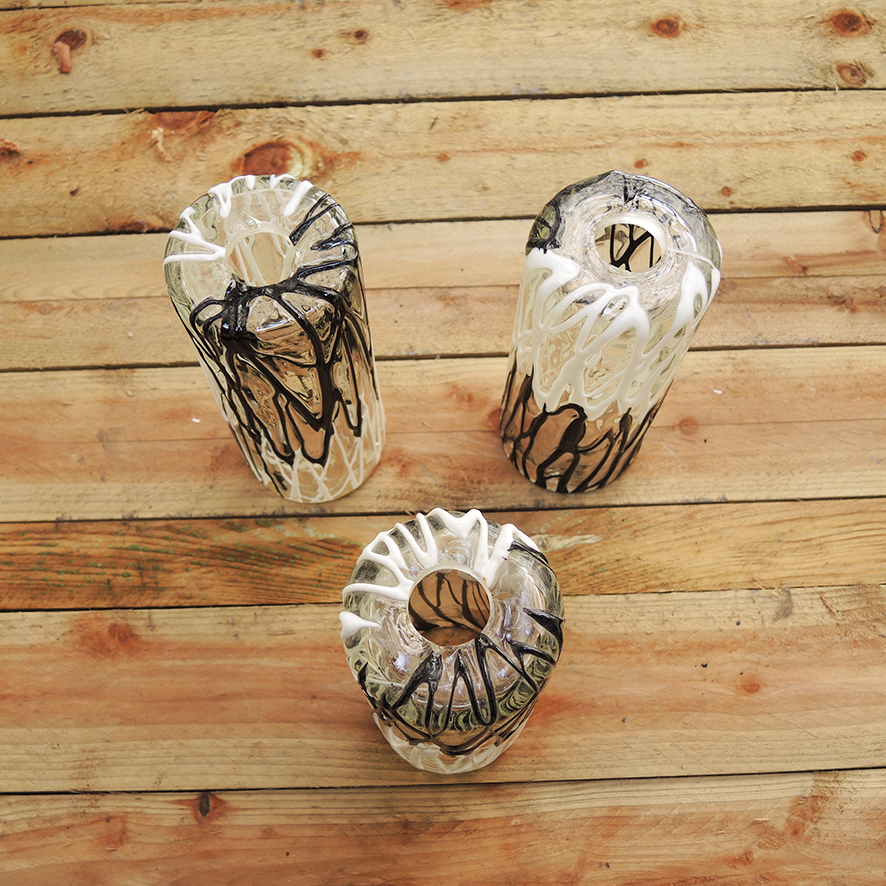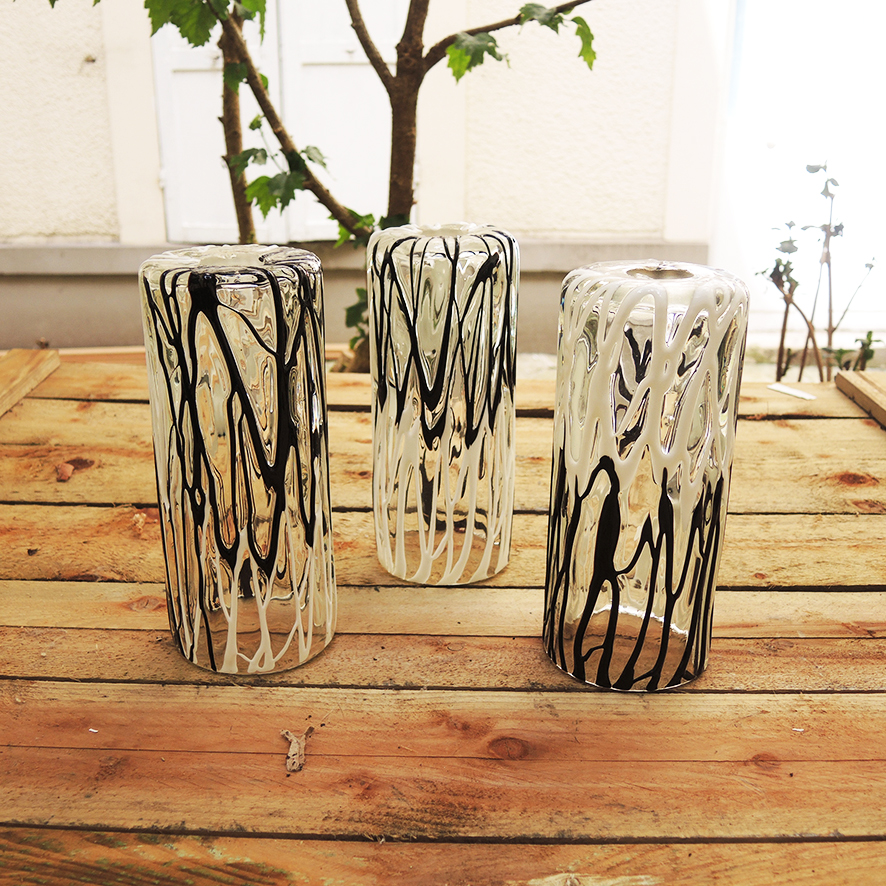 De forme tubulaire, ils sont réalisés en verre épais transparent décoré d’un ‘coulis’ d’émail noir et blanc de façon « stracciatella ».