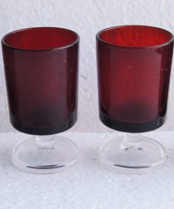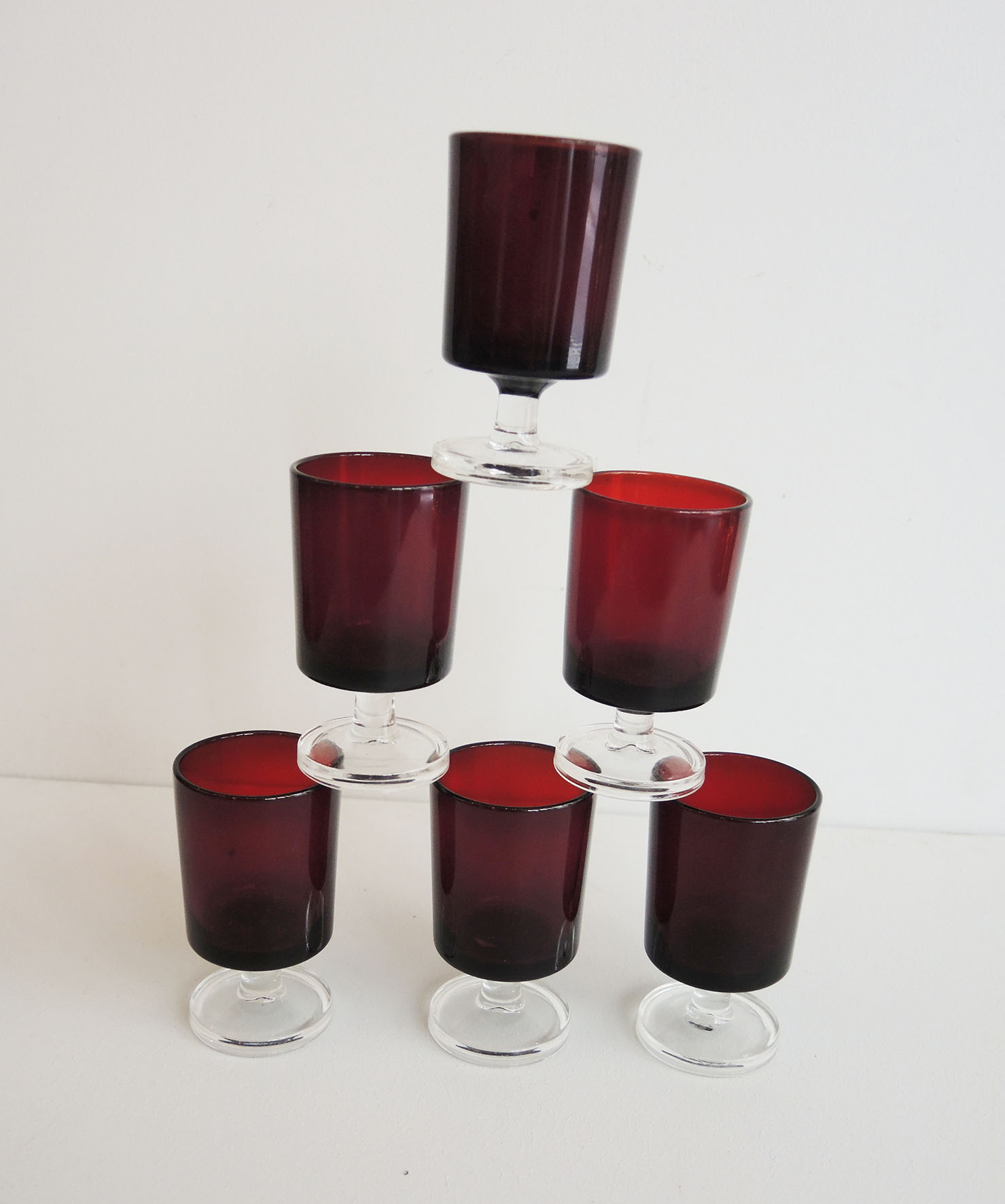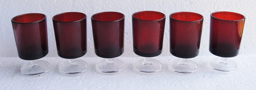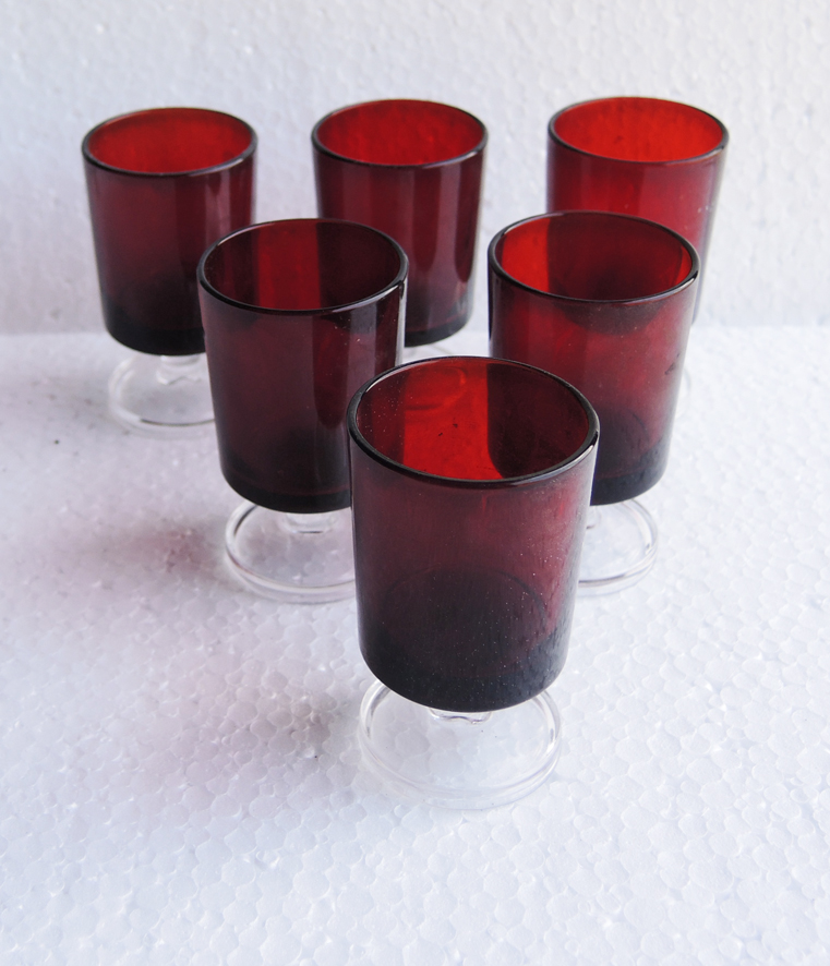Lot de 6 verres à pied vintage en verre rouge (pied transparent) qui peuvent servir comme verre à apéritif / à liqueur ou à goutte.