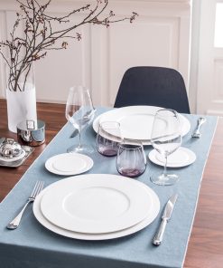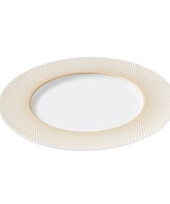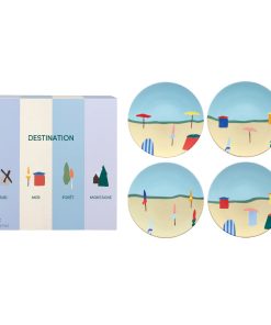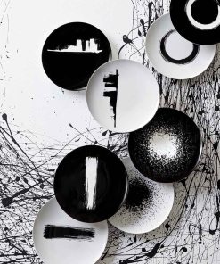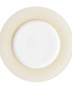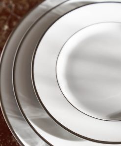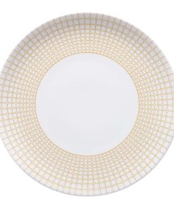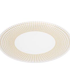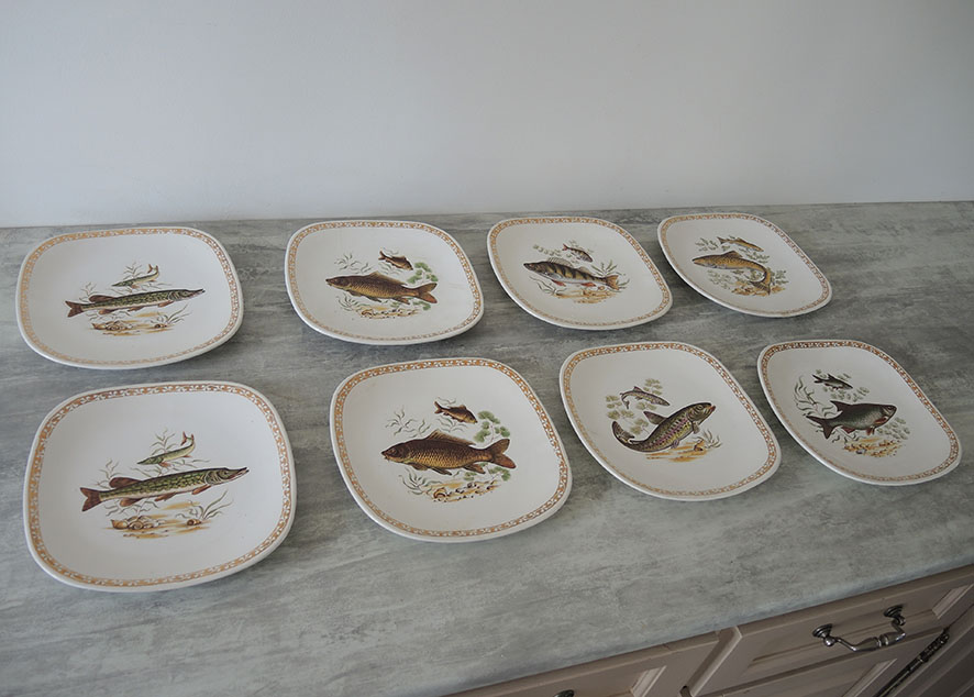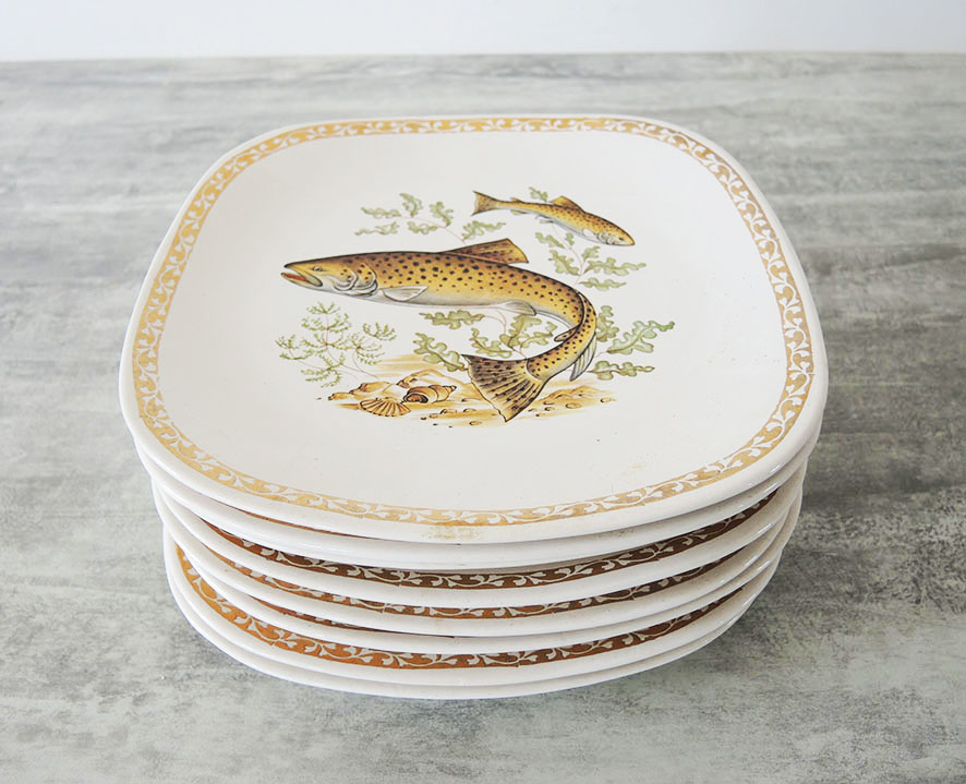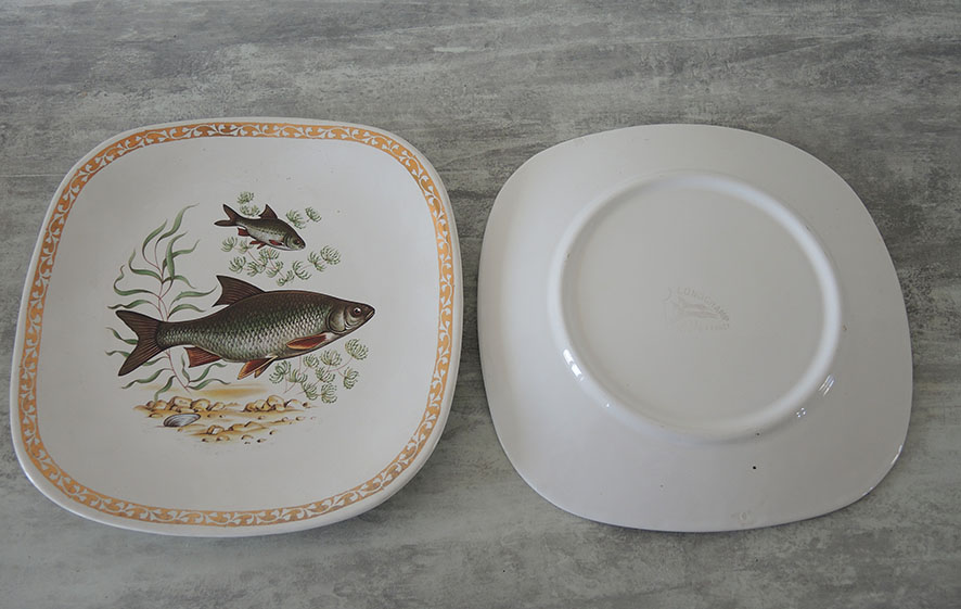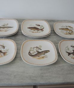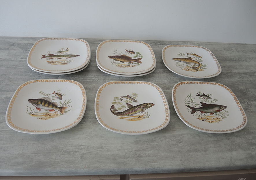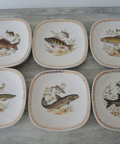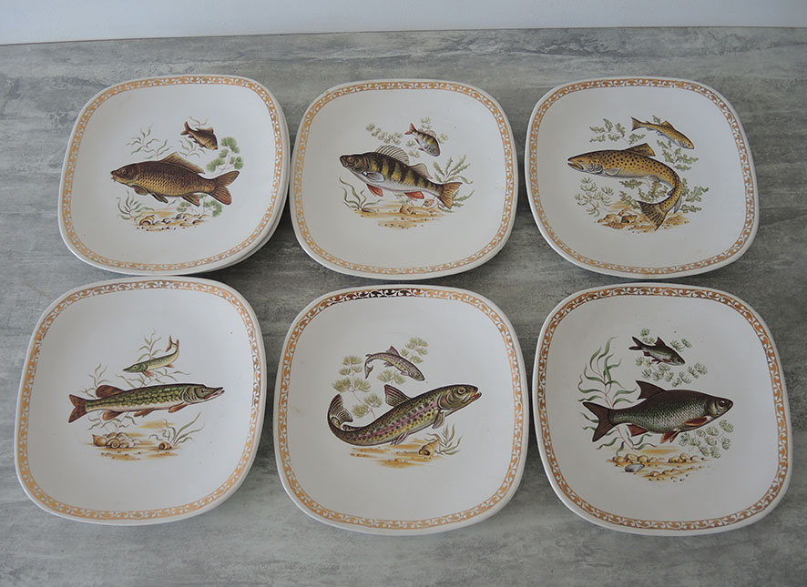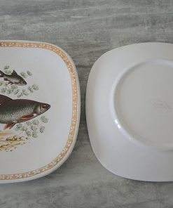 Ces pièces de vaisselle blanche à la forme carrée sont décorées de poissons (nageant) et d’un pourtour doré.