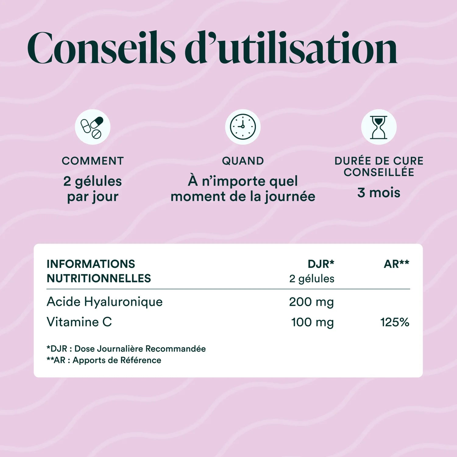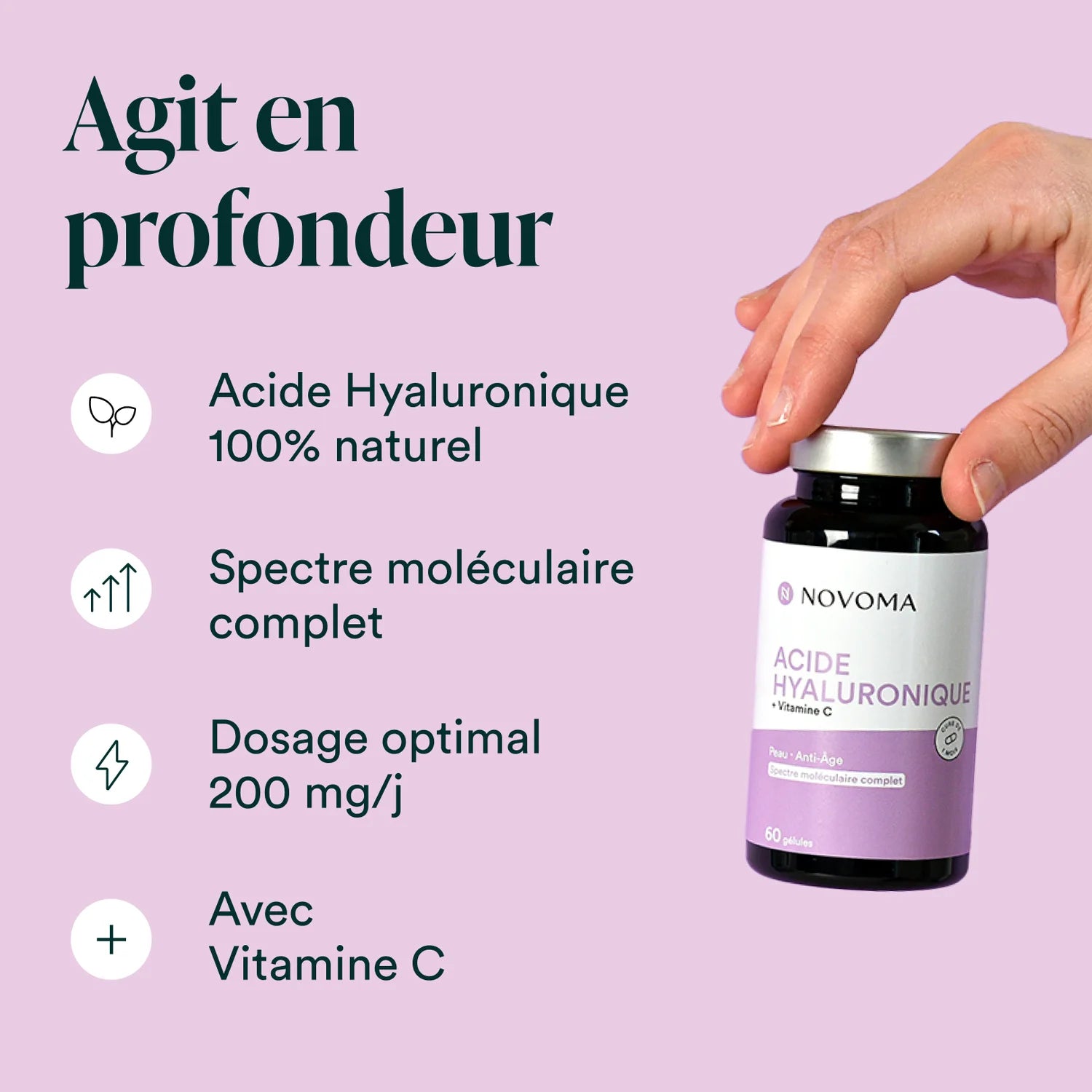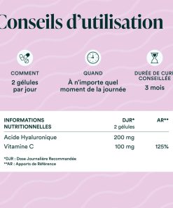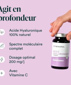 Acide hyaluronique 100% naturel au spectre moléculaire complet, associé à la vitamine C. Effets anti-âge visibles rapidement et durables dans le temps.