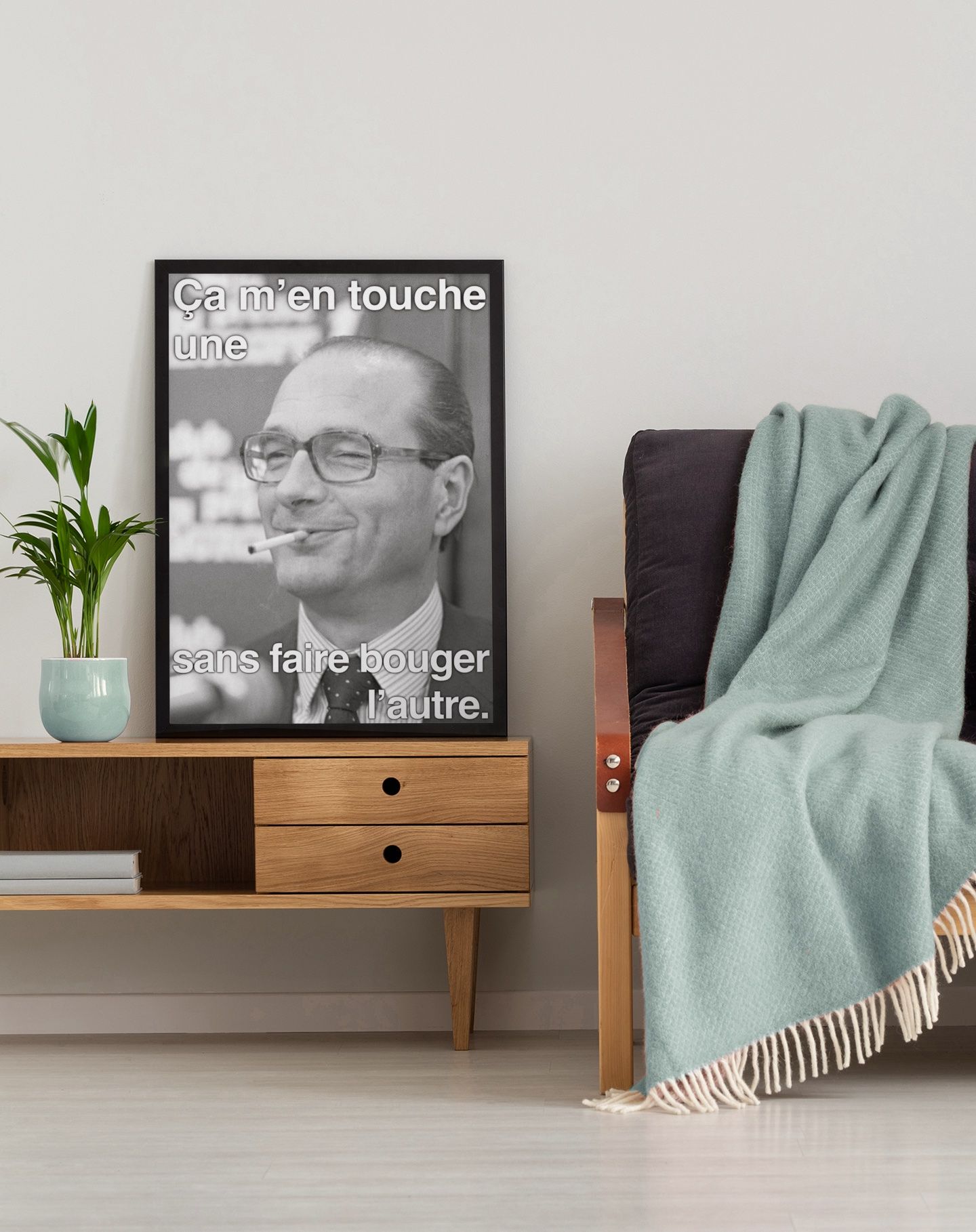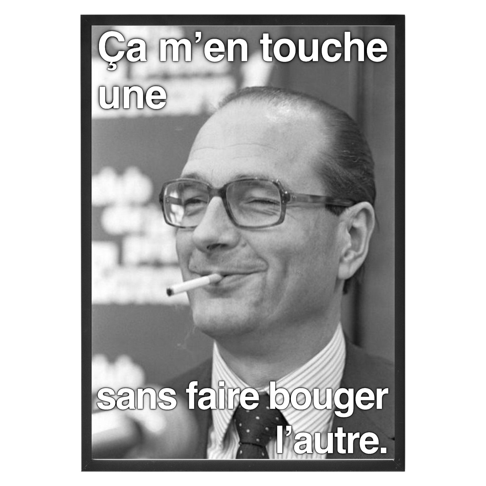 Jacques Chirac avait quand même la classe, il avait toujours la petite phrase pour faire réagir. Cette célèbre expression « Ça m’en touche une, sans faire bouger l’autre », voulait gentiment dire qu’il s’en battait les couilles, mais dans un langage politiquement correct 🙂 Pour offrir cadeau original ou se faire plaisir, cette affiche à l’effigie de Jacques Chirac sera un très bon choix. Bonne humeur garantie!
