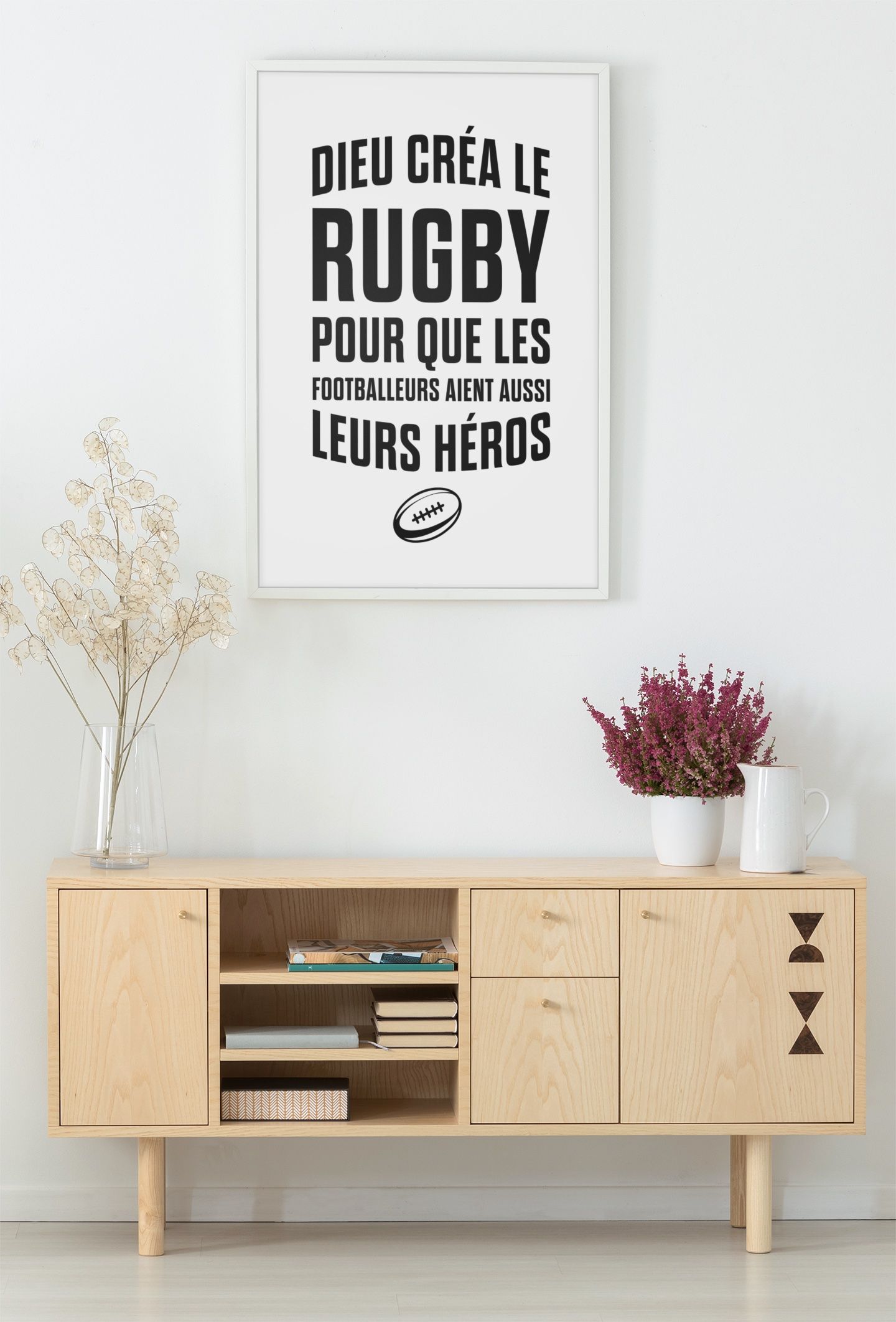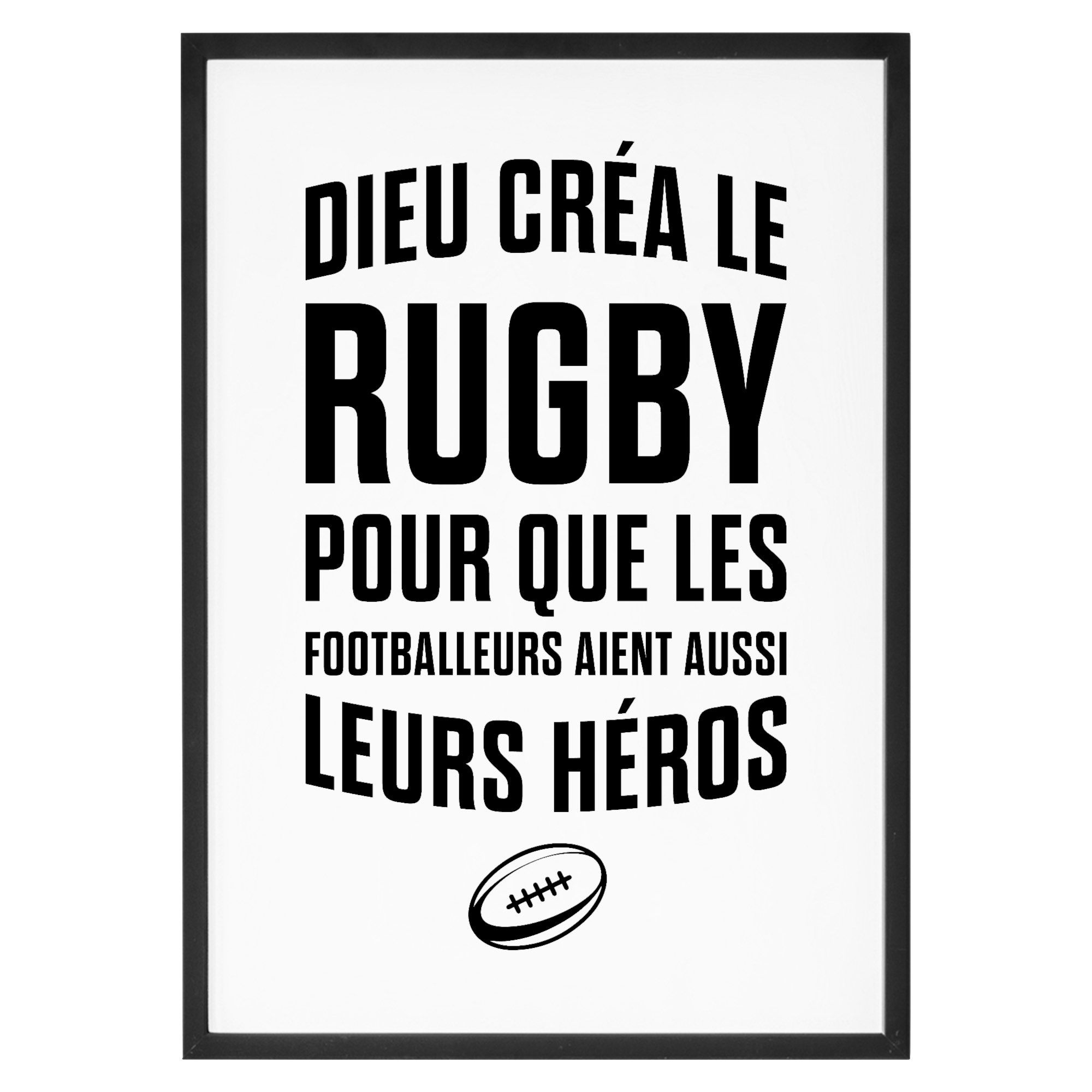 En général les joueurs ou les supporters de rugby aiment bien chambrer les footballeurs. Avec cette affiche de rugby et la phrase « Dieu créa le rugby pour que les footballeurs aient aussi leurs héros », vous allez pouvoir chambrer facilement vos amis fan de foot. Pour offrir ou se faire plaisir avec une affiche de rugbymen originale, ce sera un très bon choix. Bonne humeur garantie 🙂