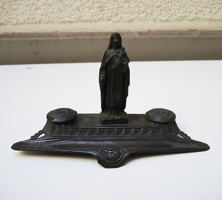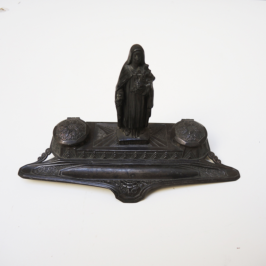 Au centre de l’encrier de dresser une statuette représentant la Vierge Marie portant un crucifix.