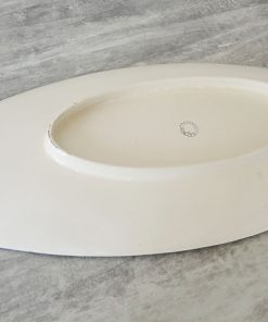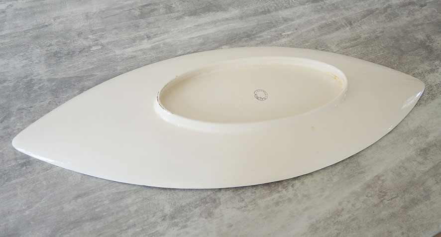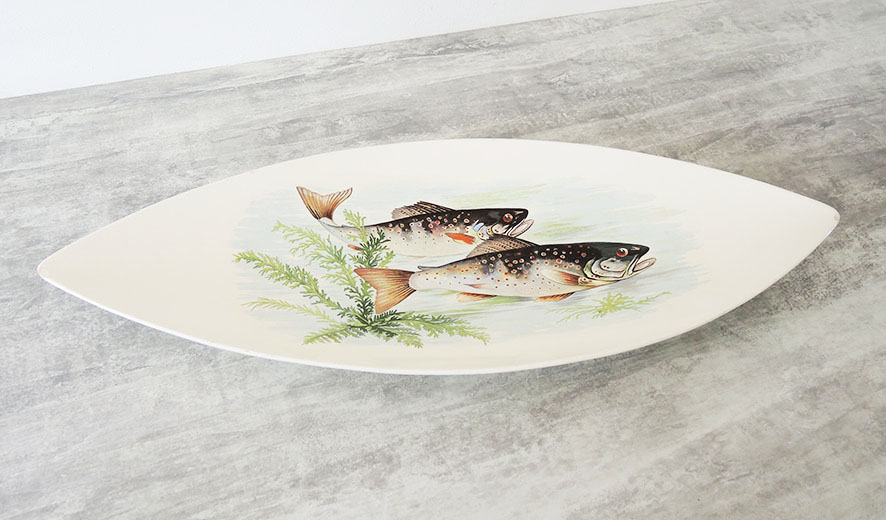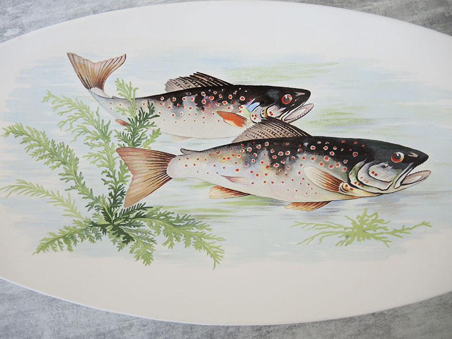 Grand plat vintage en céramique blanche décoré de jolis dessins : des poissons noir et blanc tachetés de rouge (de style truites), de la végétation aquatique, des vaguelettes…