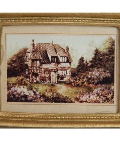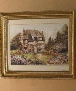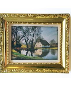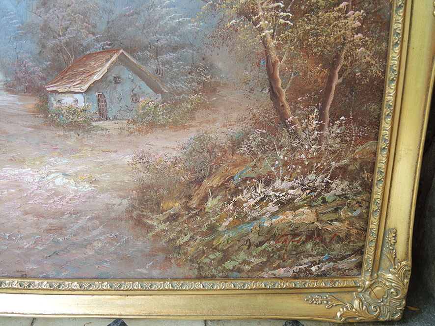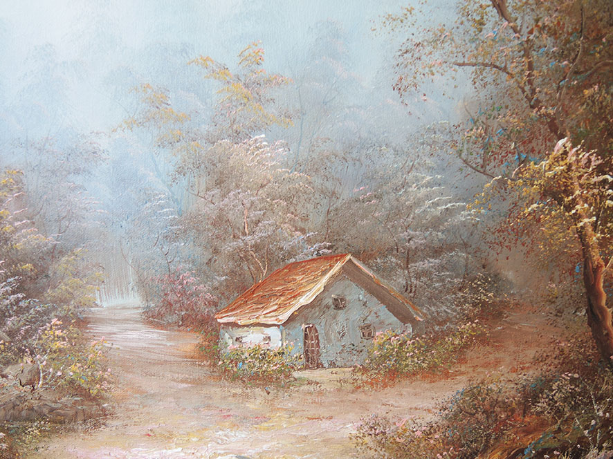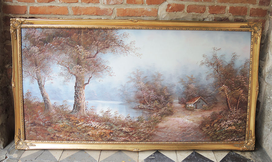 Superbe tableau à l’huile représentant une petite maison / cabane au bord d’un lac dans un paysage forestier en automne.