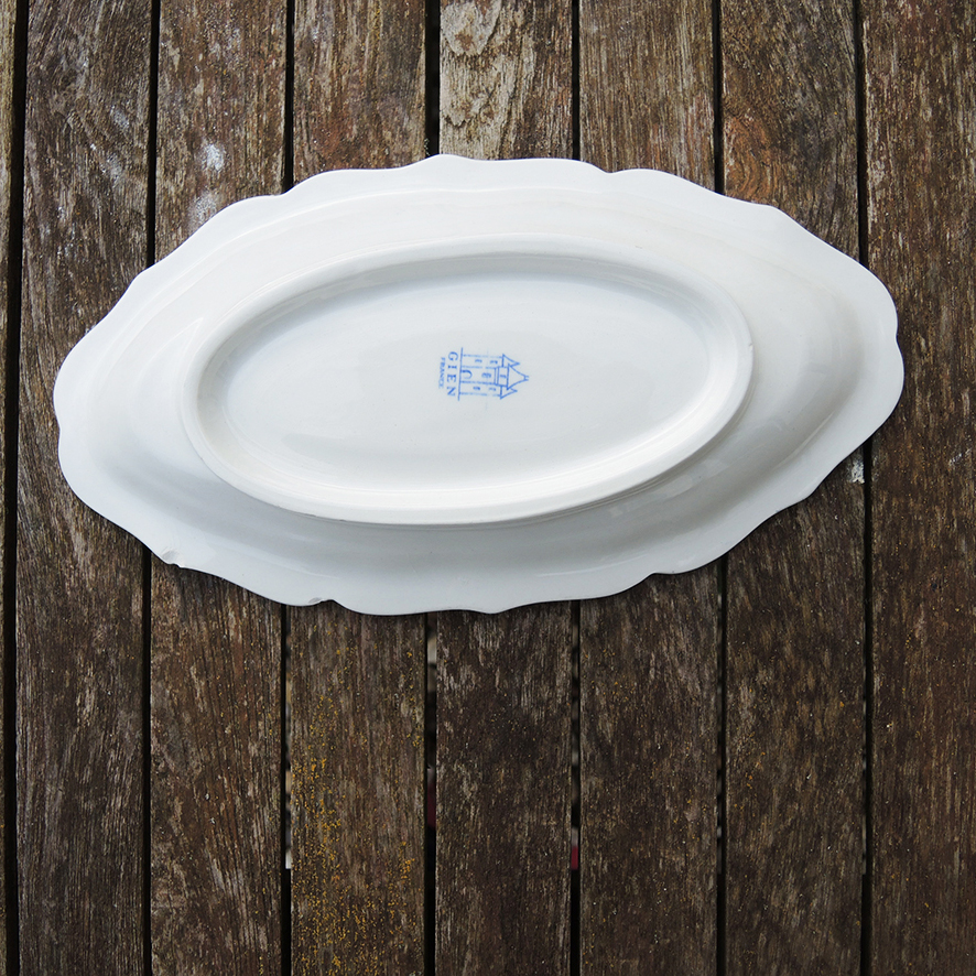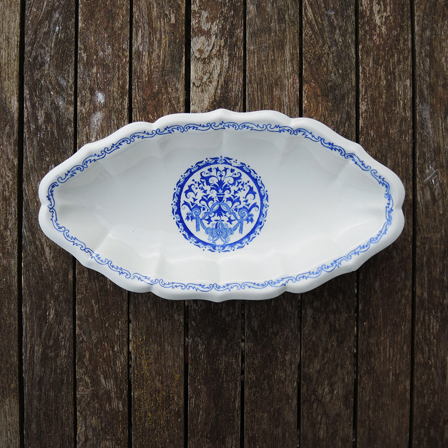 Ce modèle au bords chantournés arbore le décor Rouen : un médaillon au centre et une frise sur le contour de couleur bleu cobalt sur fond blanc.