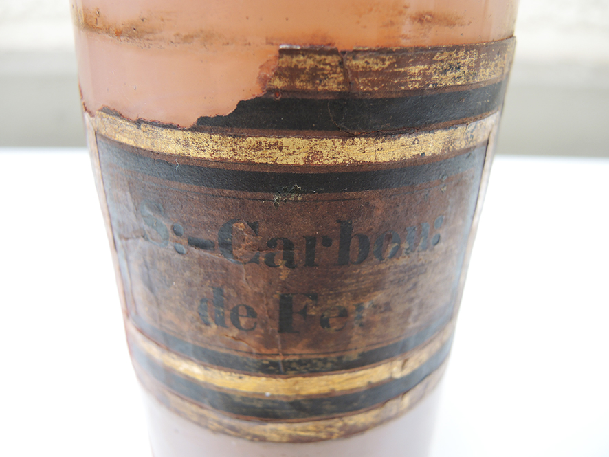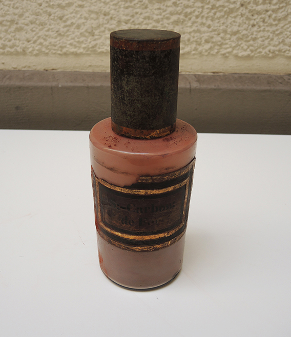 Il possède une étiquette décolorée par le temps sur laquelle il est écrit « Carbone de Fer ».