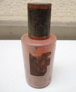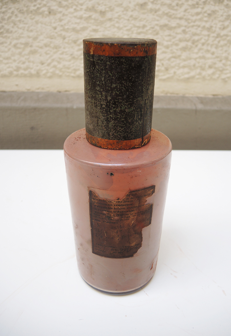 Véritable flacon de pharmacie vintage en verre opaque, avec un capuchon en tôle autrefois peinte.
