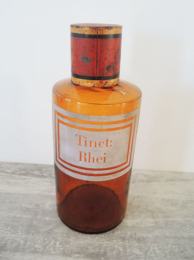 Véritable flacon de pharmacie vintage en verre ambré en tôle rouge traversé de bandes dorées et noires.