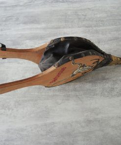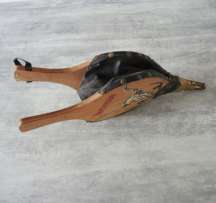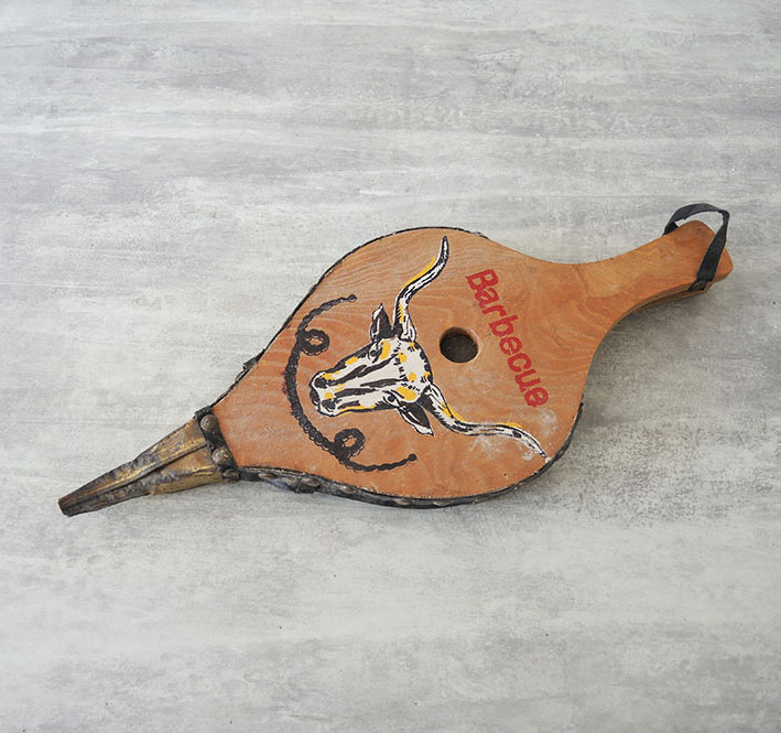 Fabriqué en bois et décoré d’une tête de taureau il est équipé d’une poignée ergonomique d’une buse en cuir souple foncé.