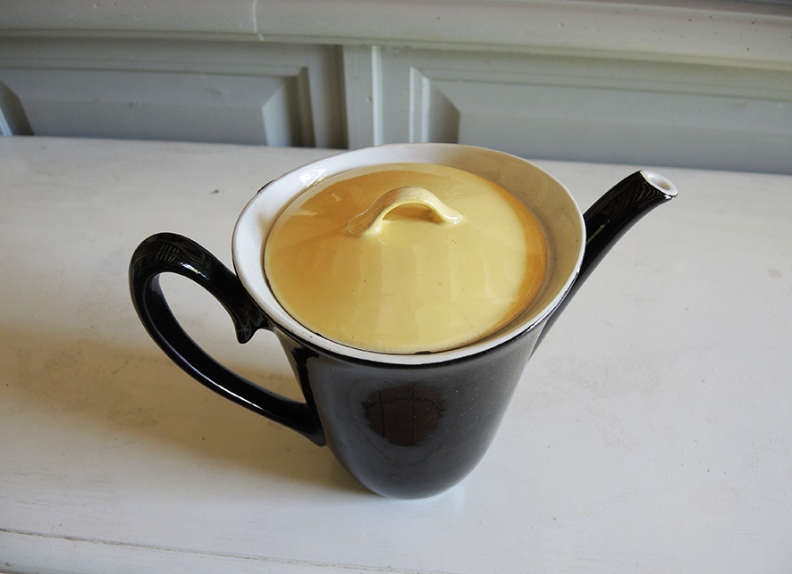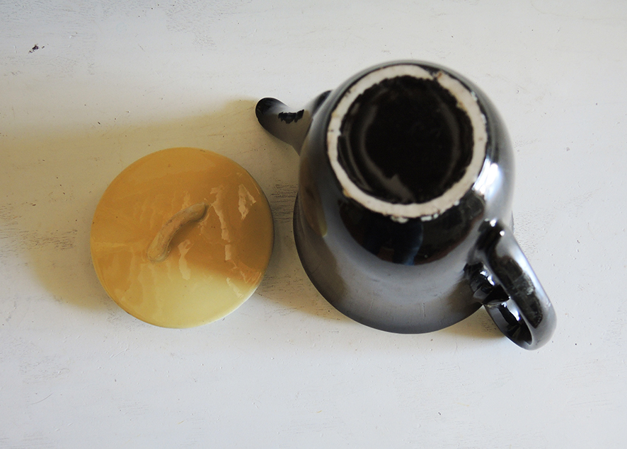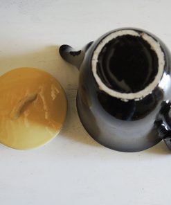 Théière vintage en faïence noire avec son petit couvercle jaune, datant des années 50.