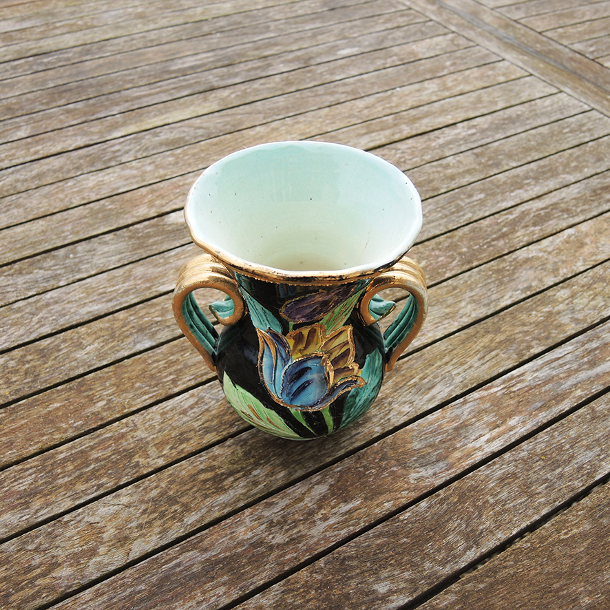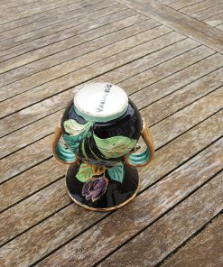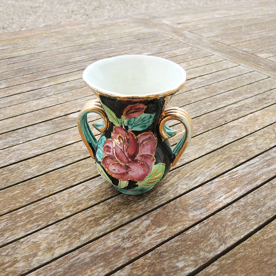 Petit vase vintage à deux anses en céramique noire orné d’un décor floral peint main à l’extérieur, et blanc à l’intérieur.
