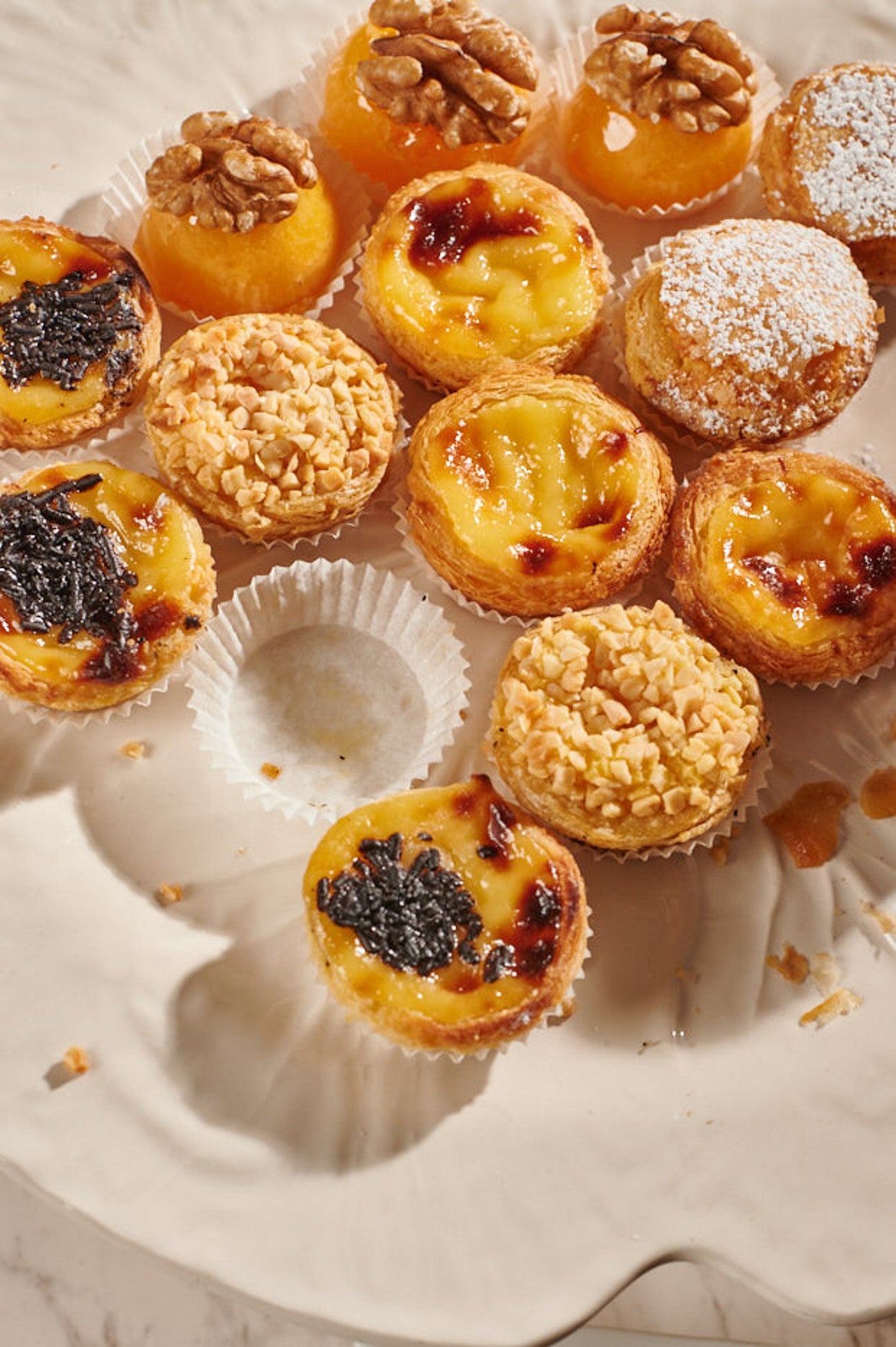 Nos incontournables pâtisseries en version mini : 6 pastéis de nata, 6 guardanapos, 6 bolas de berlim et 6 pastéis de feijão.