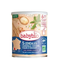 Babybio 5 céréales bio bébé, bouillie bio dès 8 mois, céréales bébé verveine fleur d’oranger camomille, alimentation bio bébé Maroc, céréales bio digestes bébé, repas du soir apaisant bébé, diversification alimentaire bio bébé.