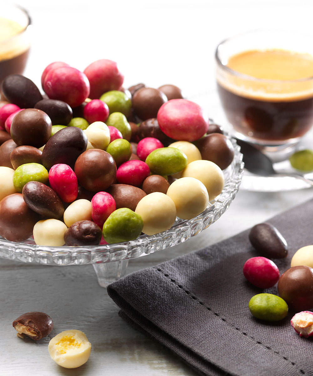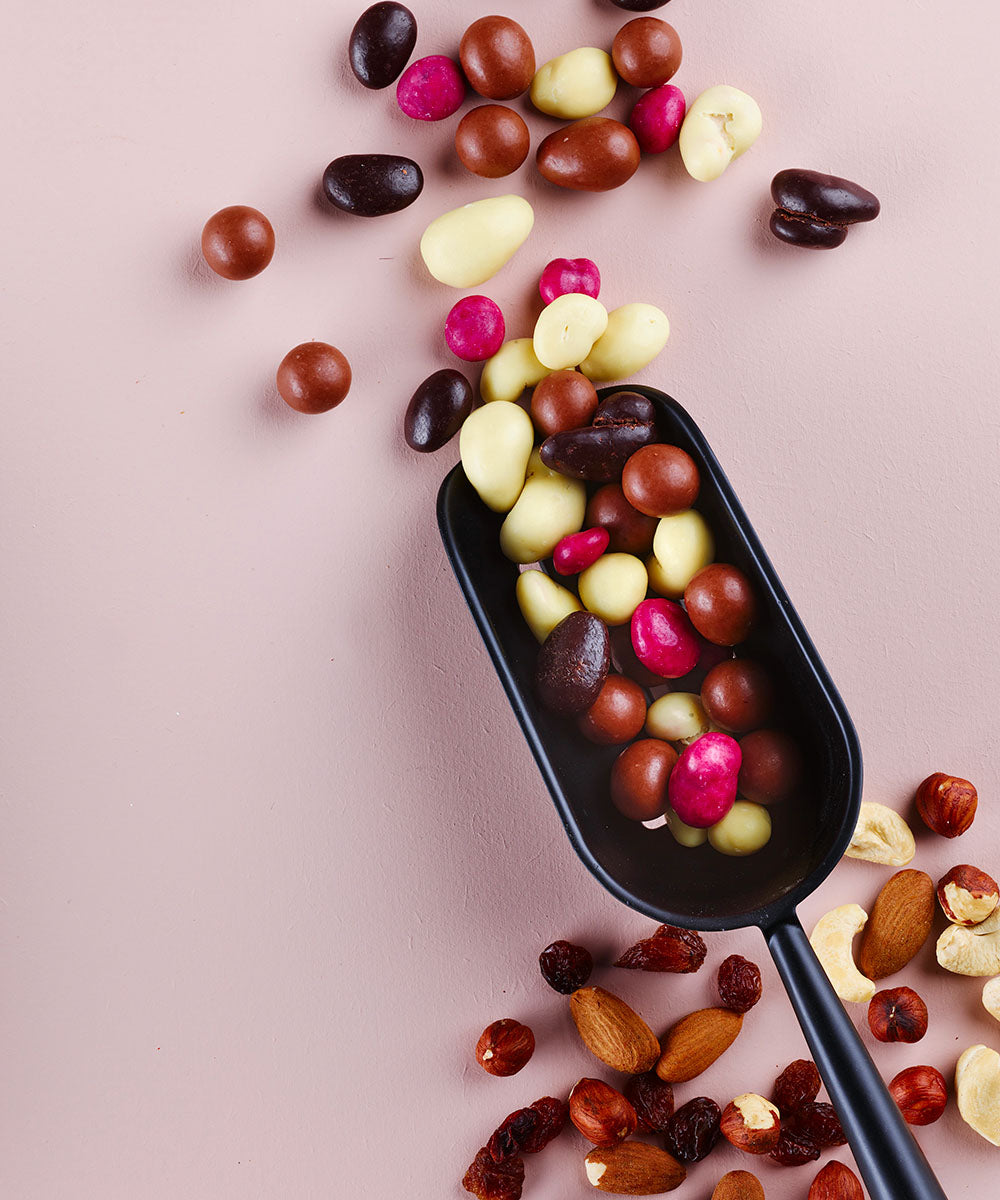 Amande chocolat noir 74%, noisette chocolat lait, noix de cajou chocolat blanc et raisin chocolat blanc (coloré en rouge avec du jus de betterave). Le mélange idéal pour régaler tous vos sens !