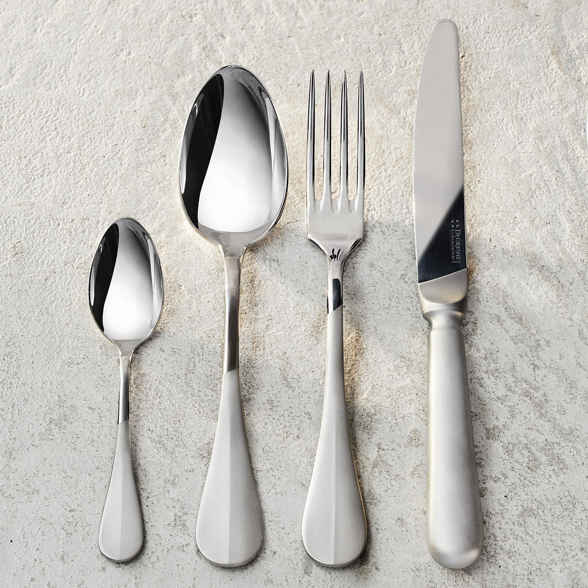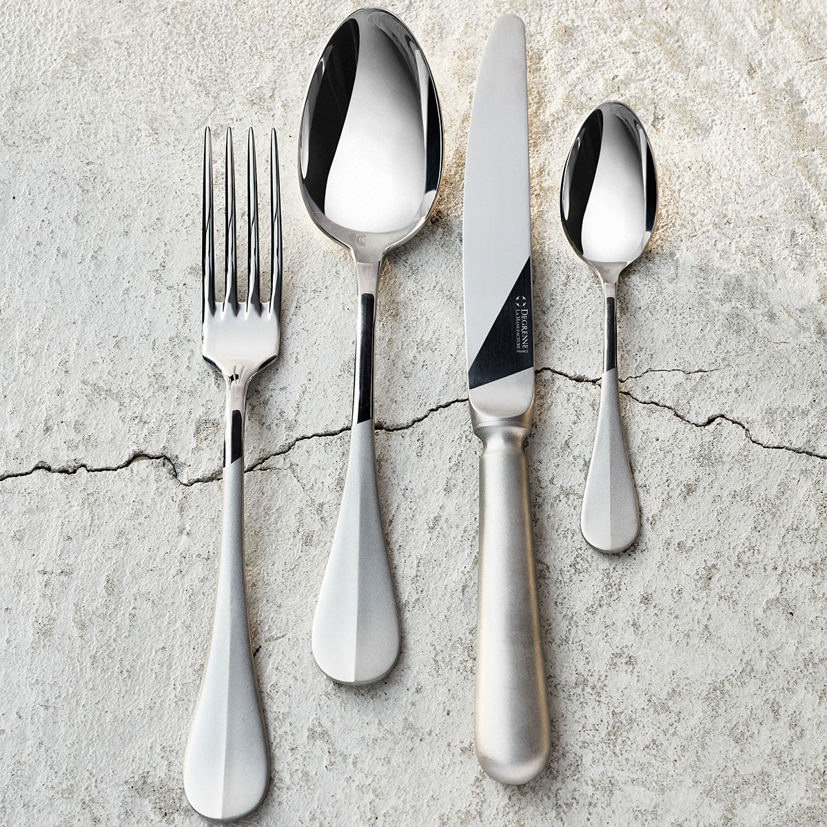 Une finition tout en contraste qui réveille et chahute la très classique collection BLOIS. La Collection BLOIS CONTRASTÉ est réalisée dans la manufacture DEGRENNE de Vire (Normandie, France) et incarne le savoir-faire de notre Maison : le travail de l’inox et la maîtrise des finitions précieuses et délicates. Avec son design graphique et contemporain, cette nouvelle collection met en scène le contraste des finitions et du style. En jouant sur les lignes asymétriques, le modèle BLOIS CONTRASTÉ bouscule le classicisme d’un couvert archétype et lui apporte un twist de modernité. Le jeu des finitions miroir et mat appuie le choix graphique du Design.