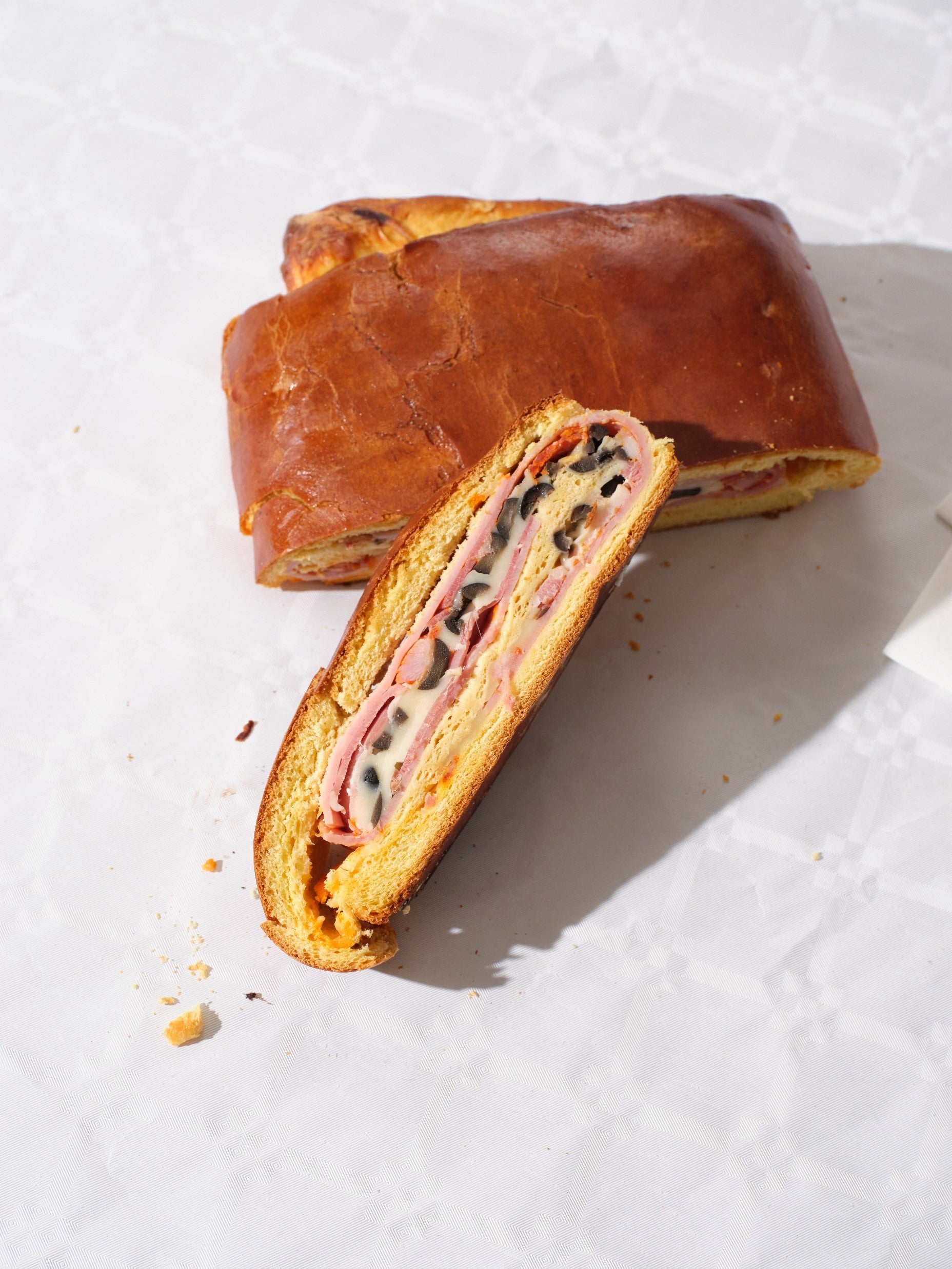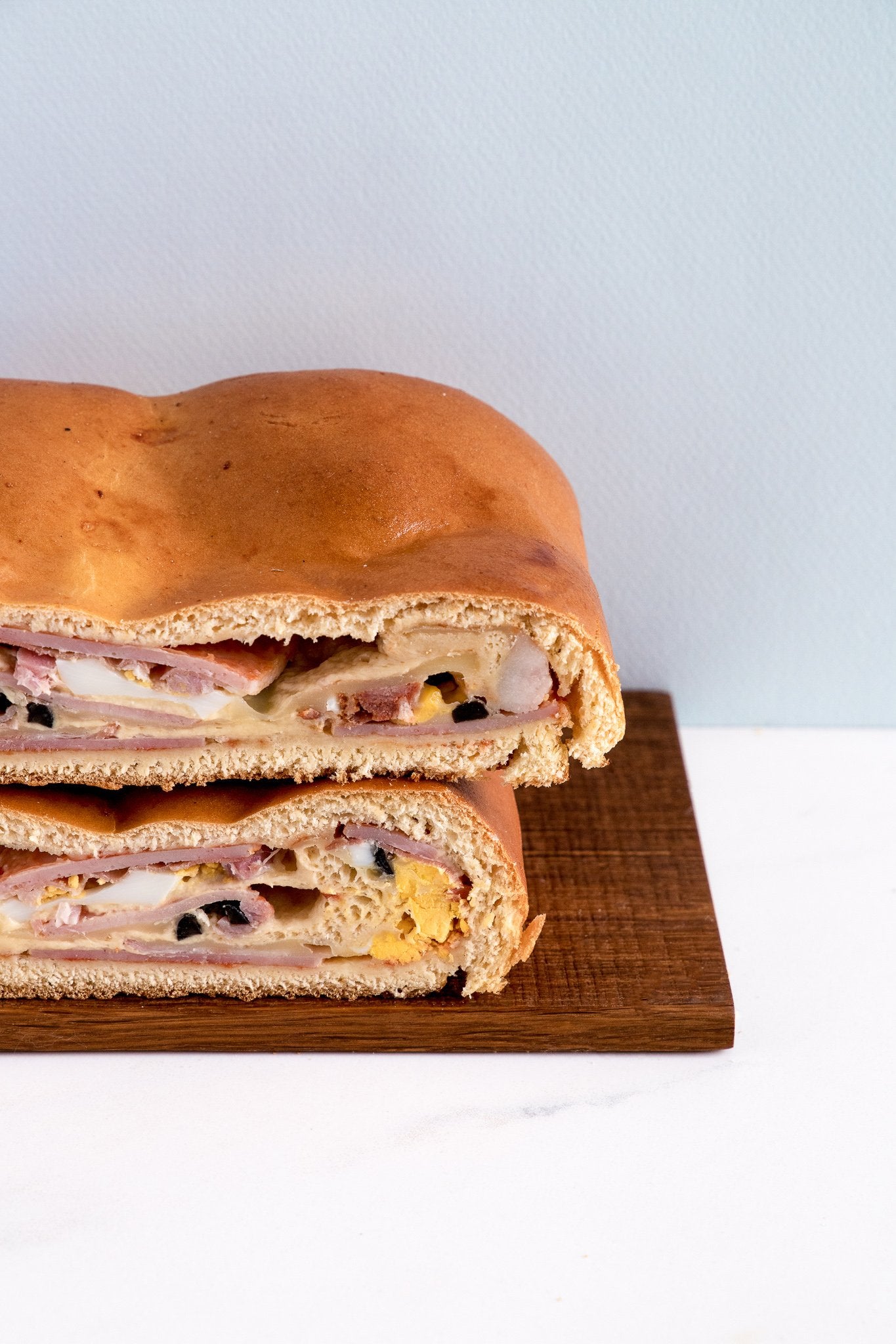 Cette brioche généreusement garnie au jambon, fromage, oeuf durs et olives fera son effet sur votre table de pâques. Environ 1kg
