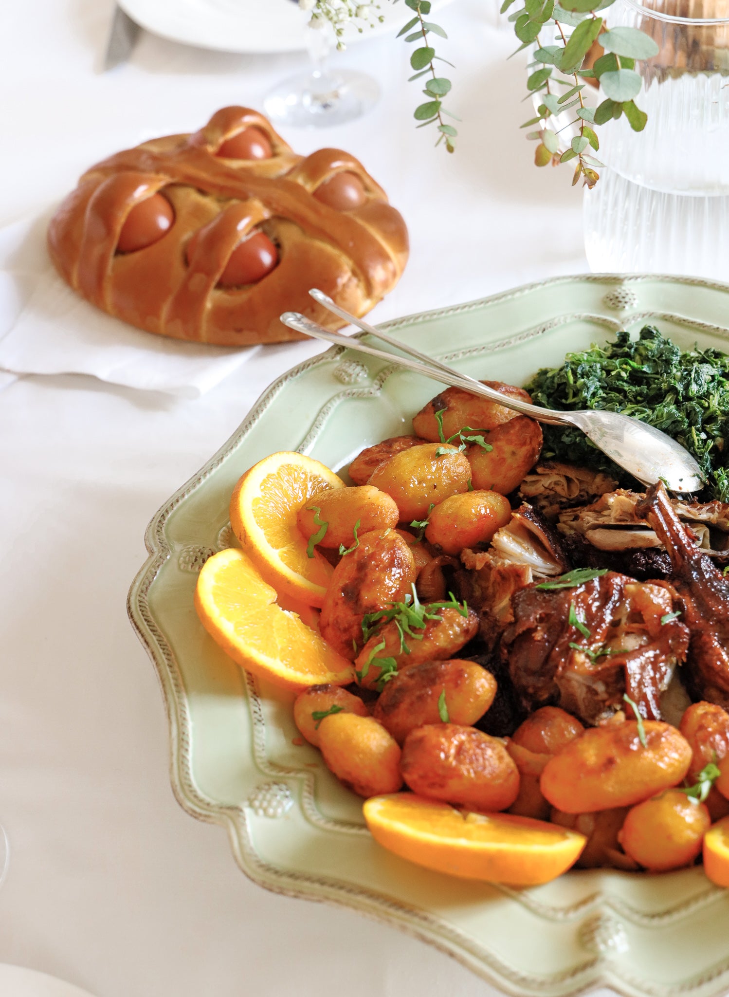 Chevreau rôti au four mariné au vin blanc, laurier et thym. Un plat riche en saveurs authentiques. Ce chevreau est accompagné de fanes de navets sautés et pommes de terre au four.