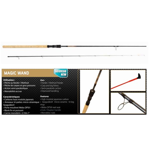 209264 – Cette gamme de canne feeder “MAGIC WAND ” est utilisée pour la pêche des gros poissons et de la carpe au feeder ou au Method. Son action semi parabolique permet de combattre les gros poissons. La 2.10 m est une monobrin, la 2.40 m est en deux brins.