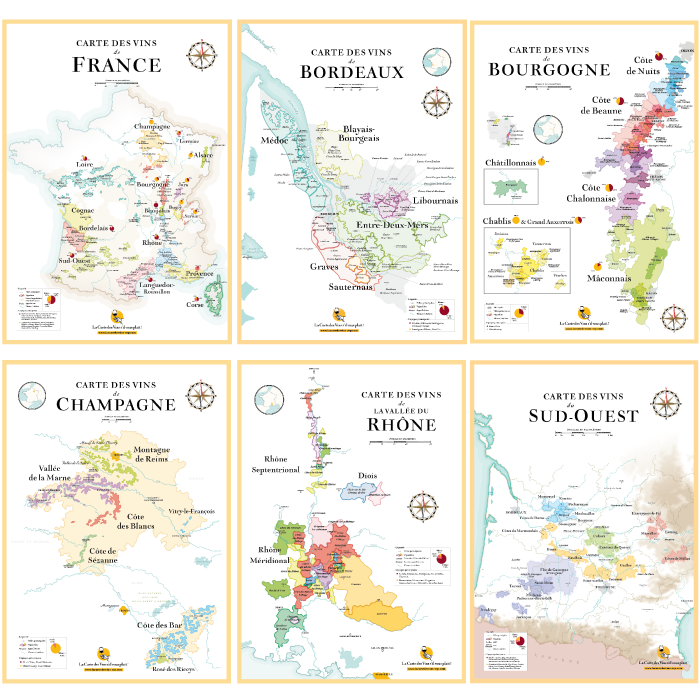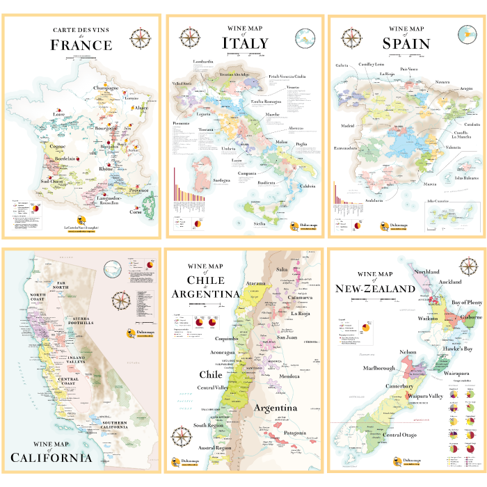 Cartes des vins de France, Italie, Espagne, Portugal, Allemagne, Australie, Californie, Chili-Argentine, Nouvelle-Zélande, Bordeaux, Bourgogne, Champagne, Piémont, Toscane & Afrique du Sud.