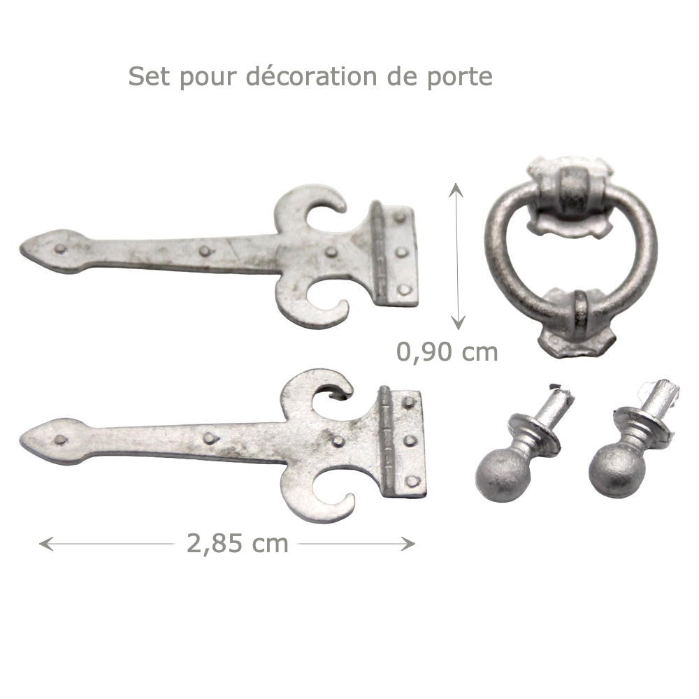 Set comprenant : 2 Boutons de portes – 2 Charnières de décoration et 1 heurtoir