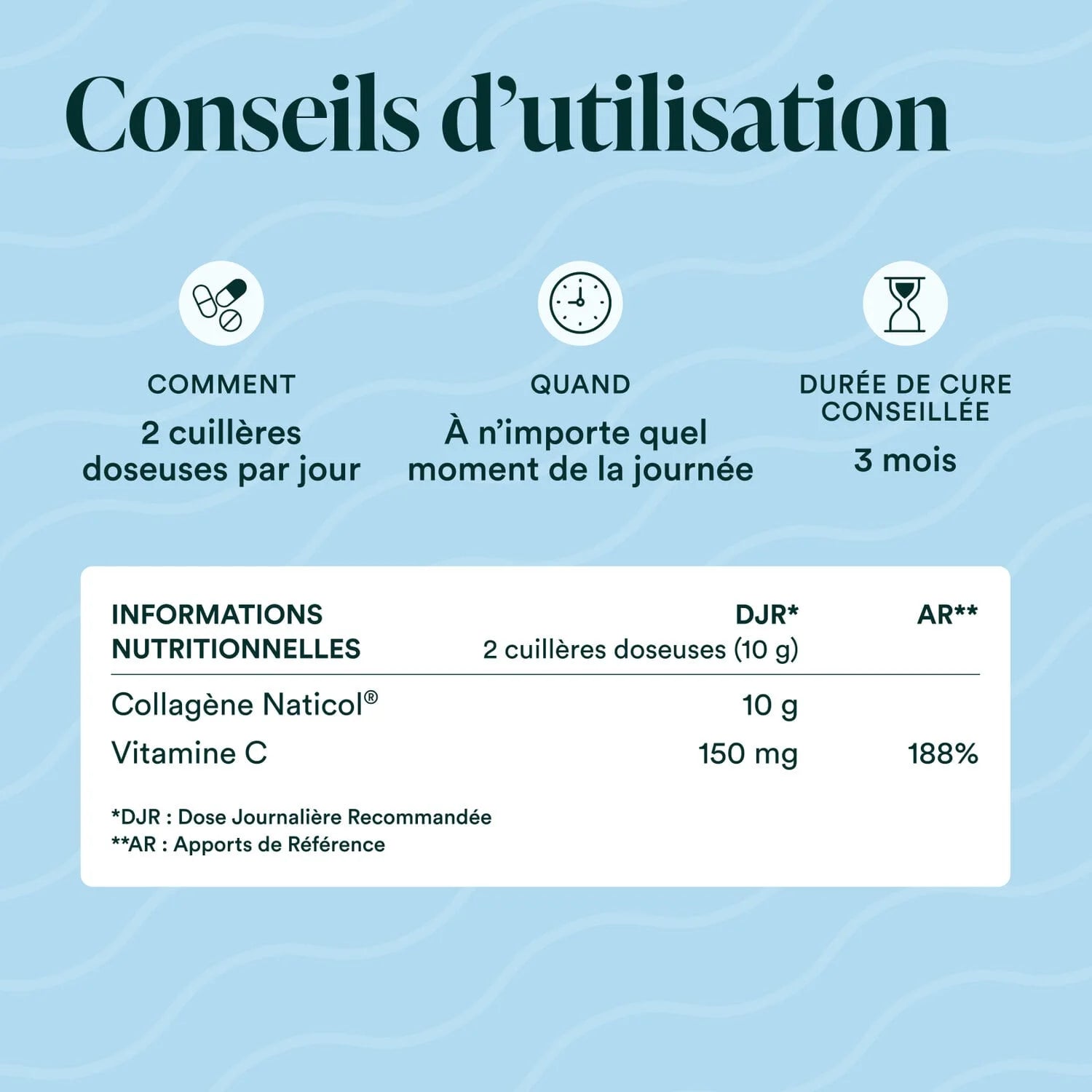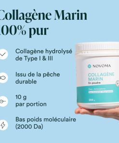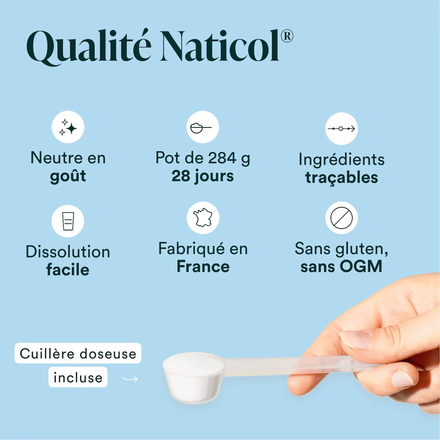 Collagène Marin en poudre Naticol® de Type I et III, issu de la pêche durable, à l’efficacité cliniquement prouvée. Améliore l’élasticité de la peau et soulage les douleurs articulaires.