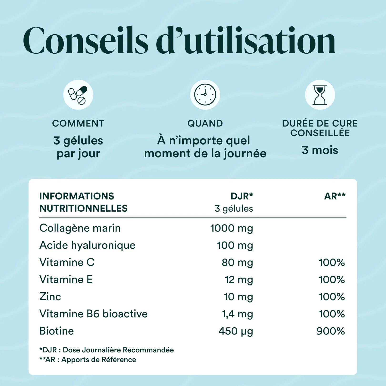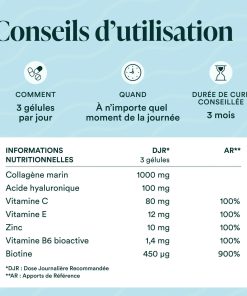 Collagène Marin Naticol® enrichi en acide hyaluronique, vitamines B6, C, E, Biotine et Zinc pour nourrir de l’intérieur votre peau, vos cheveux et vos ongles.