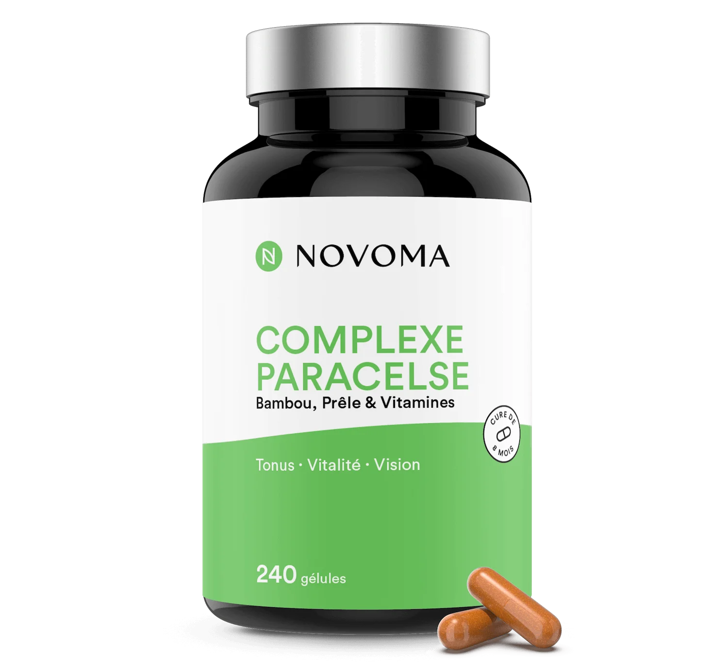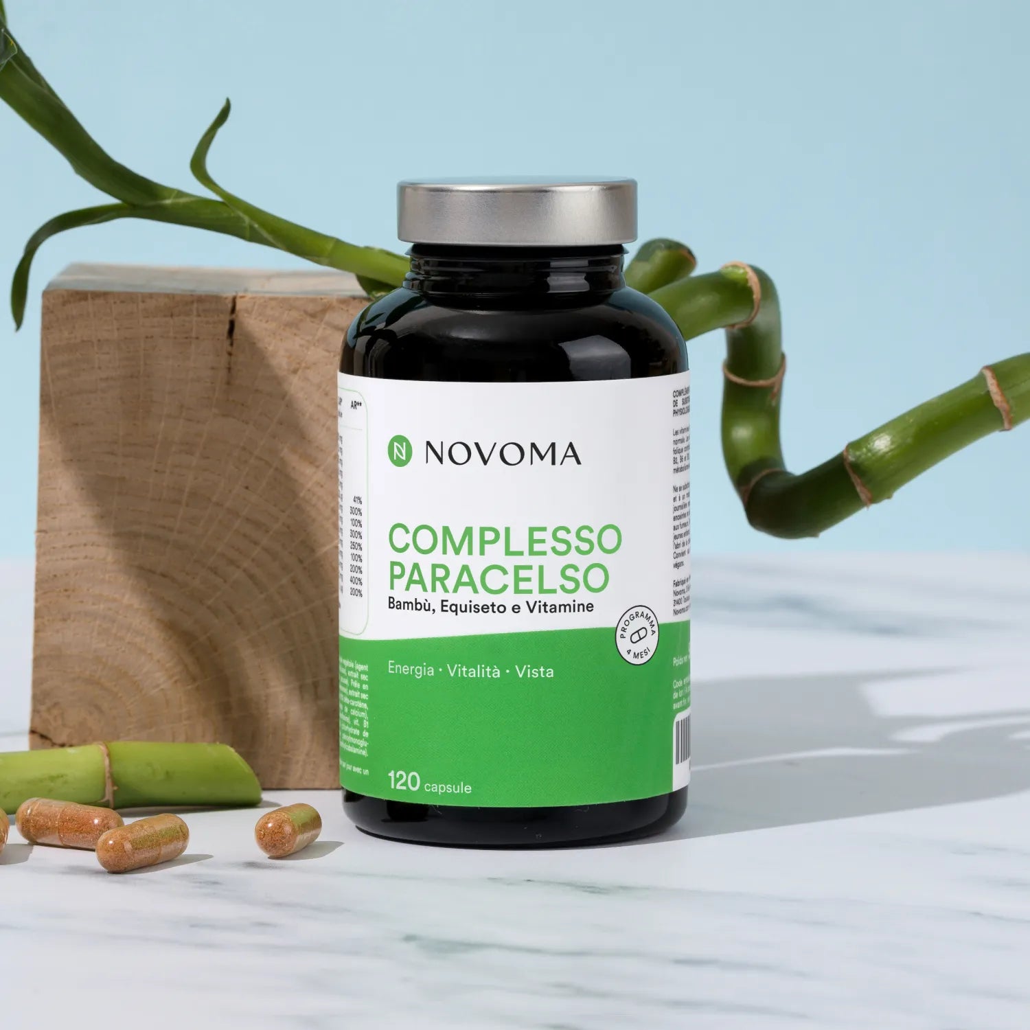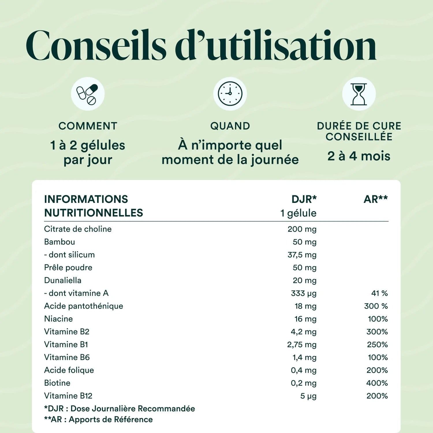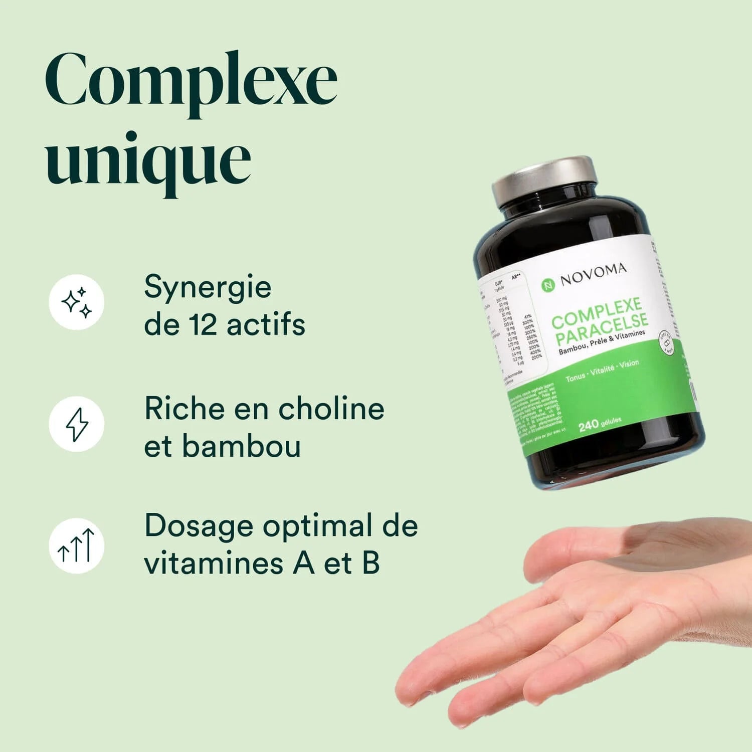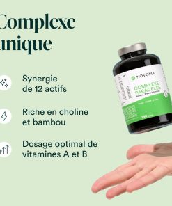 Formule unique composée de 12 ingrédients (choline, bambou, vitamines B et vitamine A) conçue pour soutenir la vitalité, les défenses immunitaires et les articulations.
