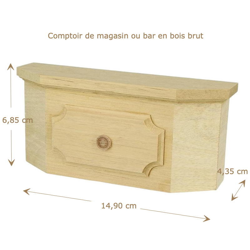 Découvrez notre comptoir de magasin ou pour un bar en bois brut, parfait pour enrichir l’ambiance de votre maison de poupée à l’échelle 1:12. Ce comptoir, avec sa niche arrière, allie esthétique et fonctionnalité. Son design sobre permet une intégration harmonieuse dans divers décors, tout en offrant une opportunité de personnalisation grâce à sa finition en bois brut.