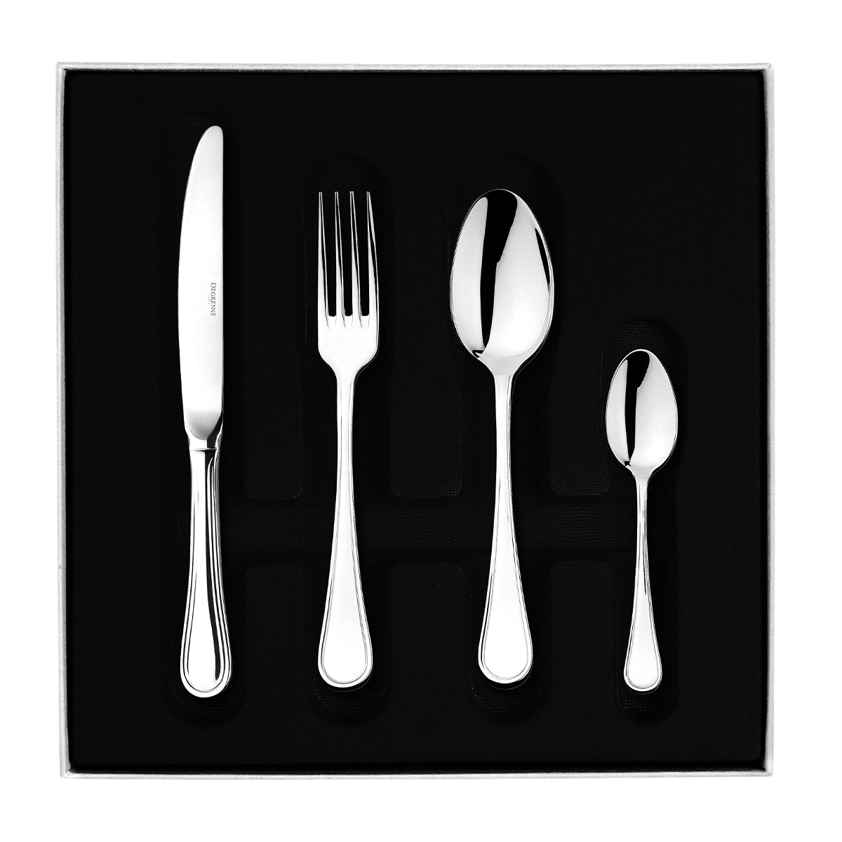 La collection de couverts CONFIDENCE de DEGRENNE est une référence classique et intemporelle qui reflète une élégance discrète et perpétue la tradition des arts de la table à la française. Réalisés dans un acier inoxydable 18-10 de la plus haute qualité, les couverts CONFIDENCE présentent une résistance exceptionnelle et sont d’un entretien très facile. Le coffret 24 pièces CONFIDENCE contient 6 fourchettes de table, 6 couteaux de table, 6 cuillère de table et 6 cuillères à café.