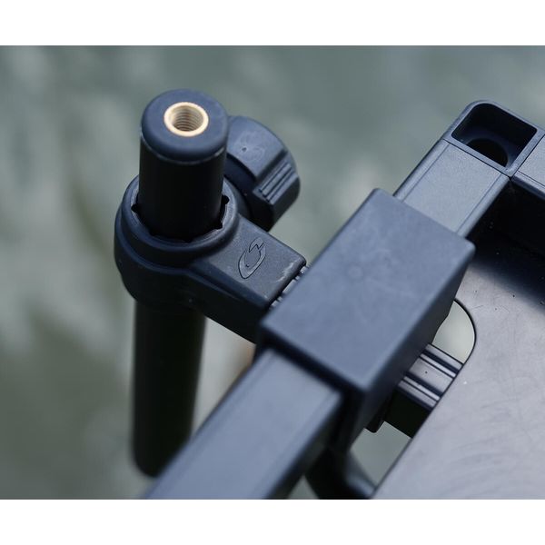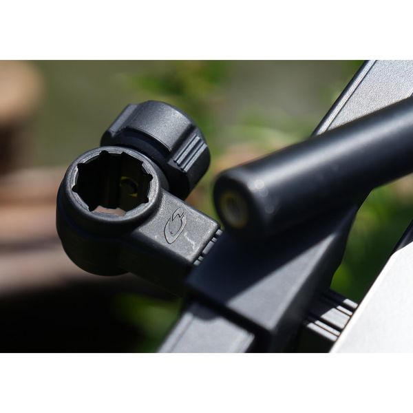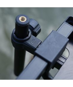 À l’extérieur, deux tiges filetées amovibles permettent de fixer un support de kit ou tout autre accessoire. Les points de fixation sont dotés d’un double mécanisme de verrouillage. Le clip métallique permet d’ouvrir complètement le bloc et de le serrer autour d’une jambe par le côté. Un bouton compact doté d’un système de serrage non marquant permet de fixer le bloc à la hauteur souhaitée. Grâce aux inserts fournis, l’ouverture de 36 mm peut être réduite à 30 mm. La position des points de fixation peut être ajustée en fonction de la distance entre les pieds du panier-siège.