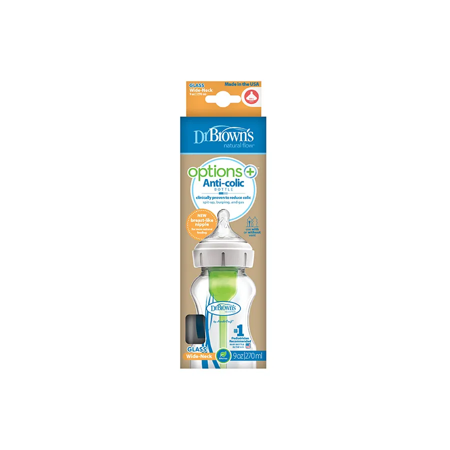 Cette bouteille est en verre clair borosilicaté. Ce verre est résistant à la chaleur et a une durée de vie plus longue que la plupart des autres types de verre. Le biberon à col large Dr. Brown’s Natural Flow Options+ possède une tétine novatrice, similaire à l’allaitement maternel. Cela facilite la transition du sein maternel vers le biberon et vice versa. De la sorte, donner le biberon devient un plaisir, pour vous comme pour votre bébé. La tétine en silicone doux a été spécialement conçue pour permettre un écoulement uniforme et naturel, imitant l’allaitement maternel.