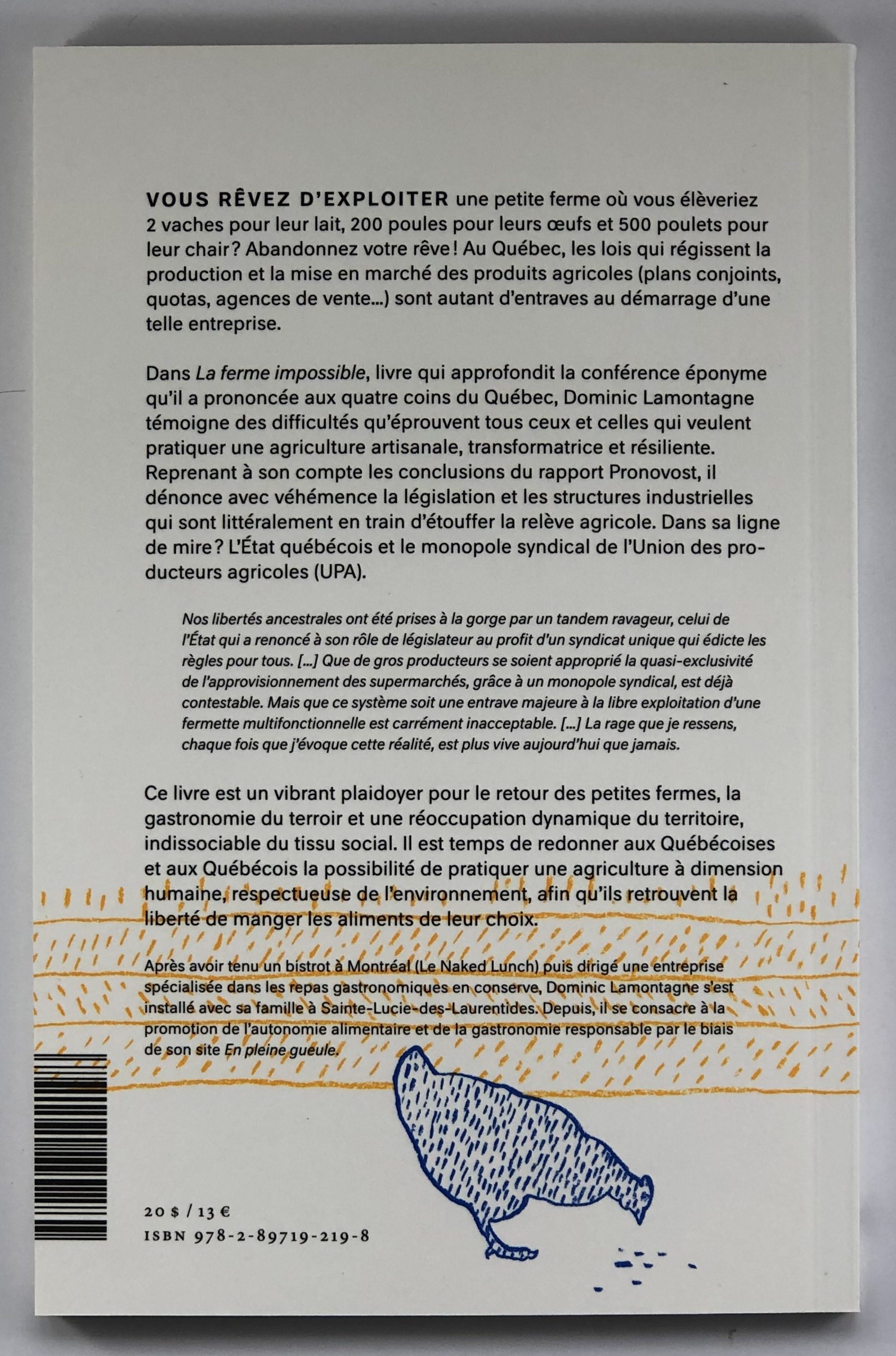 Dans La ferme impossible, livre qui approfondit la conférence éponyme qu’il a prononcée aux quatre coins du Québec, Dominic Lamontagne témoigne des difficultés qu’éprouvent tous ceux et celles qui veulent pratiquer une agriculture artisanale, transformatrice et résiliente. Reprenant à son compte les conclusions du rapport Pronovost, il dénonce avec véhémence la législation et les structures industrielles qui sont littéralement en train d’étouffer la relève agricole. Dans sa ligne de mire? L’État québécois et le monopole syndical de l’Union des producteurs agricoles (UPA).