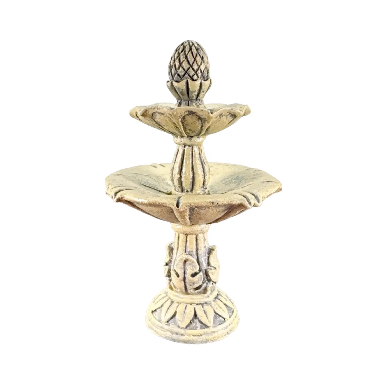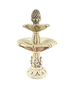 Modelée en résine robuste, la surface présente une patine beige avec ombrages subtils pour un effet pierre. Les deux vasques proportionnées assurent un beau décor. La base évasée renforce la stabilité. Les reliefs décoratifs restent nets, visibles même de loin. La Fontaine de jardin respecte l’échelle 1/12ᵉ et s’intègre facilement aux pavés, dallages ou graviers.