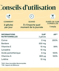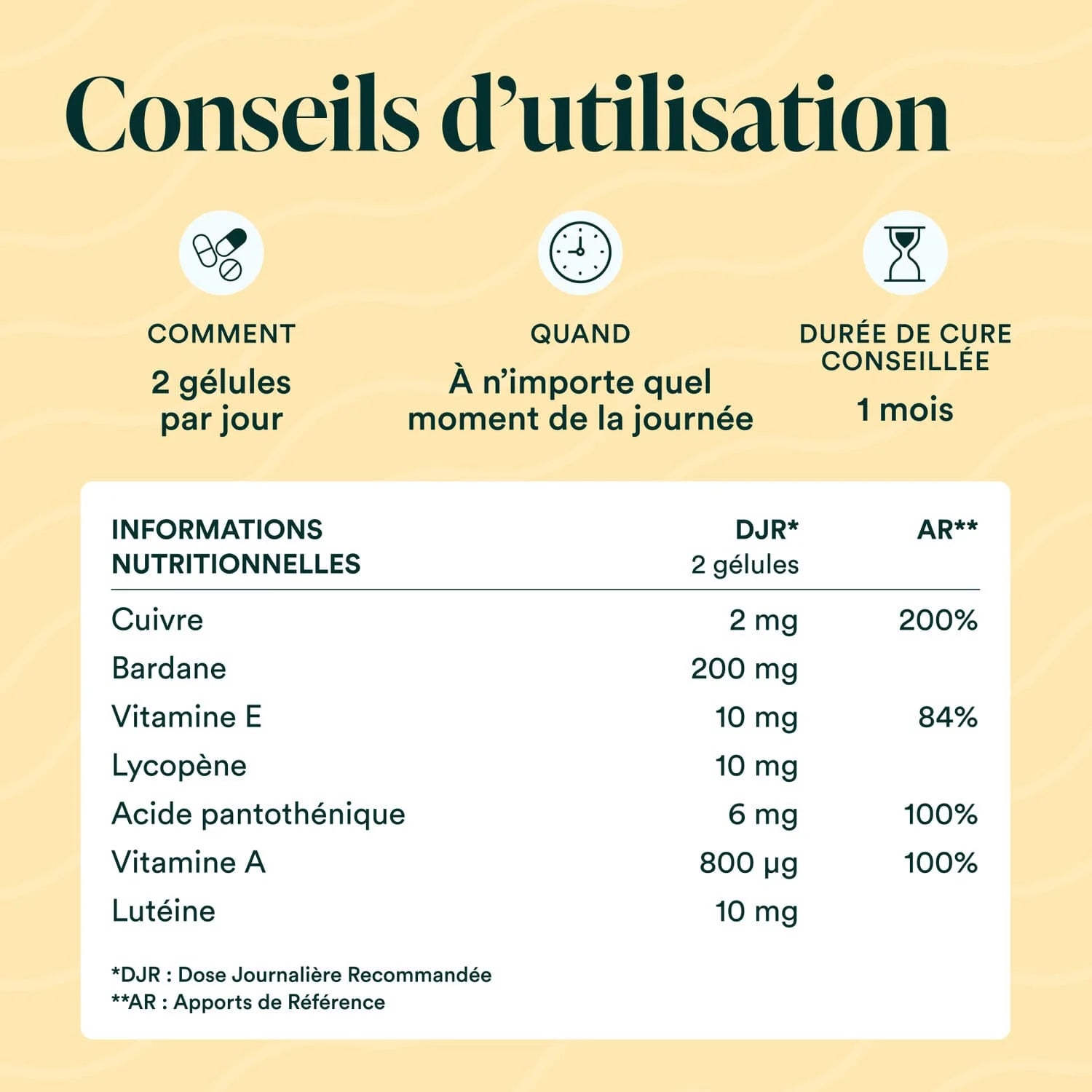 Formule à base de bardane, cuivre, vitamines et caroténoïdes naturels. Une sélection unique d’actifs pour préparer votre peau au soleil et activer, accélérer et prolonger votre bronzage.