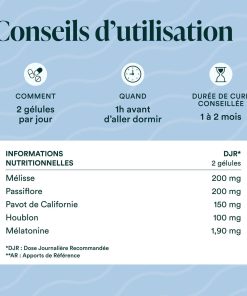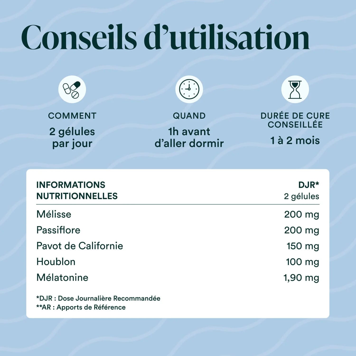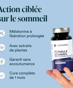 Complément alimentaire sommeil à base de mélatonine à libération prolongée Melotime™ et d’extraits de plantes sélectionnés avec soin pour leur action ciblée sur le sommeil.