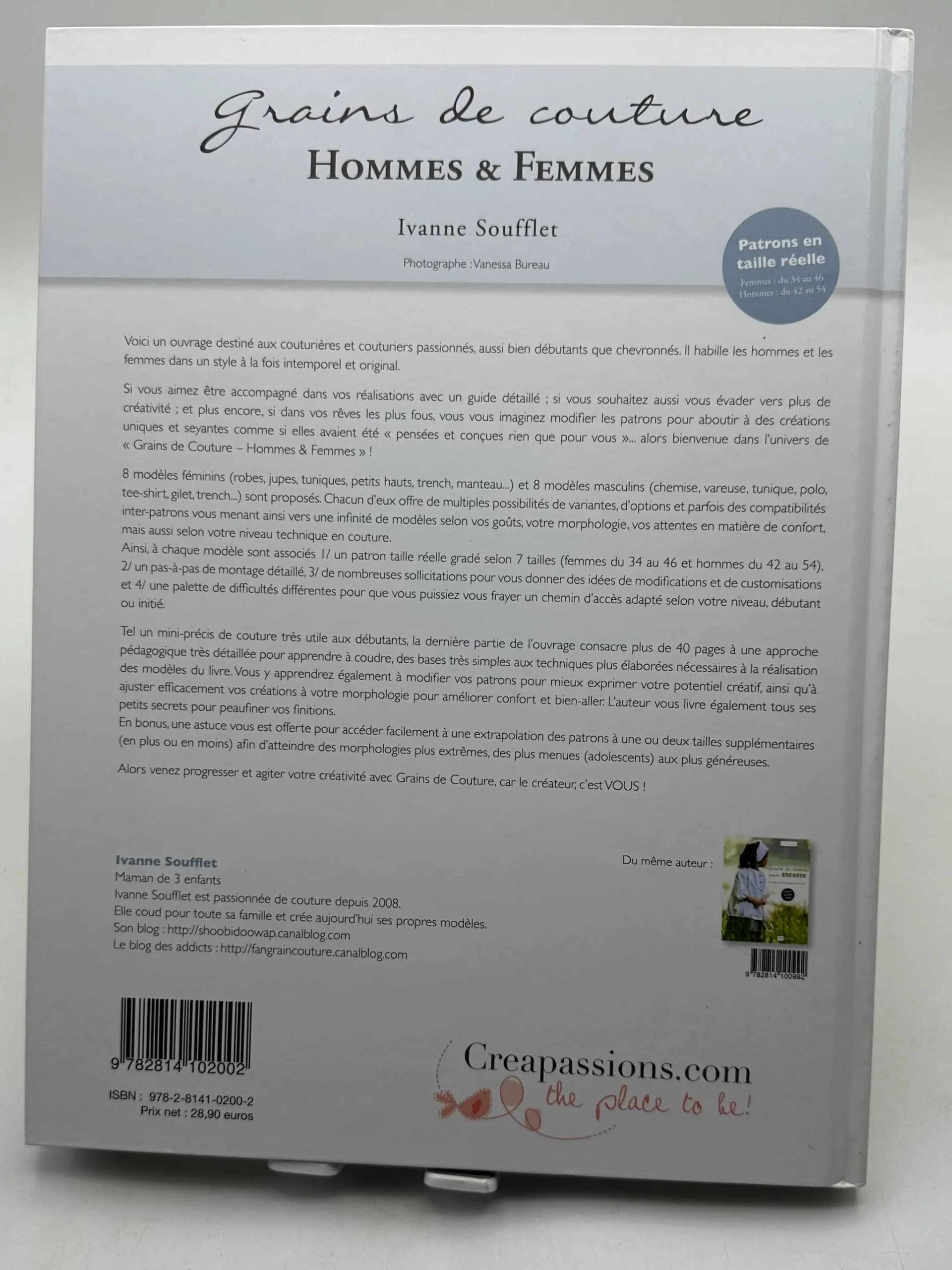 Grains de couture pour hommes et femmes » est un livre de couture écrit par Ivanne Soufflet. Il propose une sélection de modèles de vêtements pour hommes et femmes, accompagnés de patrons prêts à l’emploi et d’instructions détaillées pour les réaliser.