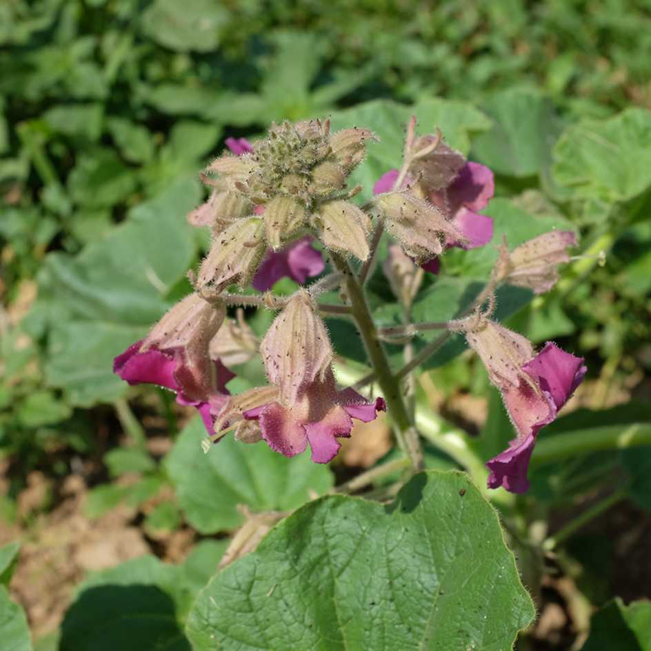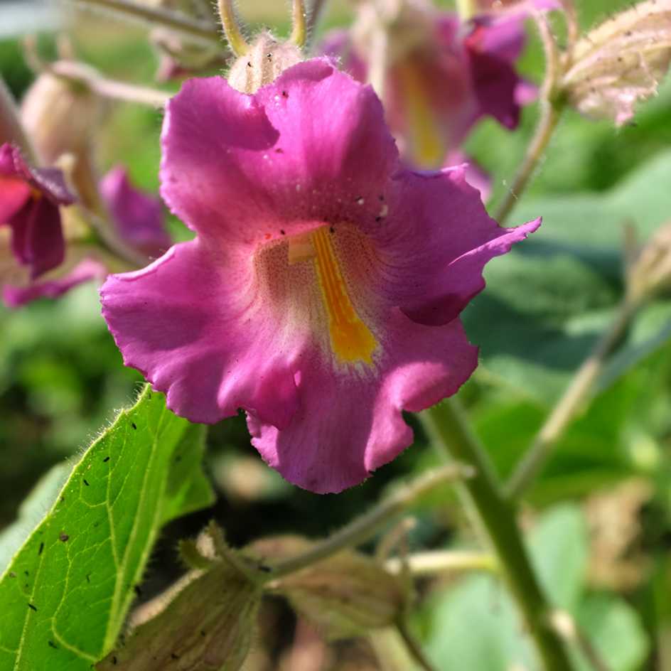La Proboscidea louisianica est une plante étonnante, connue principalement pour la forme de ses fruits secs. Originaire de milieux humides du sud-est des États-Unis, cette plante annuelle est recouverte de poils visqueux et glanduleux. Ses grandes feuilles larges au bout de tiges librement ramifiés et tentaculaires lui donne un aspect imposant. Un plant pouvant prendre en effet jusqu’à 1 m².