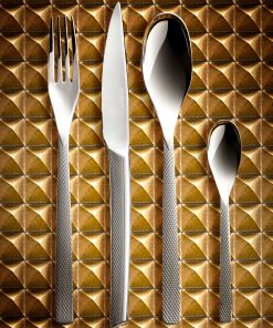 Les couverts GUEST STAR de DEGRENNE allient précision du design avec des lignes pures et modernes, et séduction avec une personnalité unique. Leurs manches sont habillés d’un décor finement gravé, inspiré d’une ciselure de taille diamant. Ce relief joue avec la lumière et fait scintiller le couvert pour le mettre en éclat sur la table. Réalisés dans un acier inoxydable 18-10 de la plus haute qualité, ces couverts présentent une résistance exceptionnelle et sont d’un entretien très facile. Le coffret 24 pièces GUEST STAR contient 6 fourchettes de table, 6 couteaux de table, 6 cuillère de table et 6 cuillères à café.