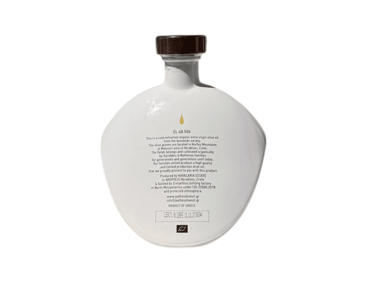 L’huile d’olive extra vierge bio Pathos incarne toute la richesse des terres crétoises. Issue de la variété Koroneiki, elle provient des oliveraies de Kavalaria, nichées au pied du mont Psiloritis. Grâce à une récolte précoce, elle dévoile une saveur fruitée, vive et légèrement poivrée. Chaque goutte révèle la force d’un terroir méditerranéen d’exception.