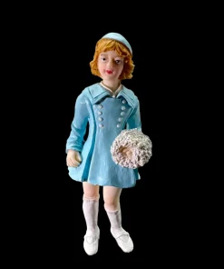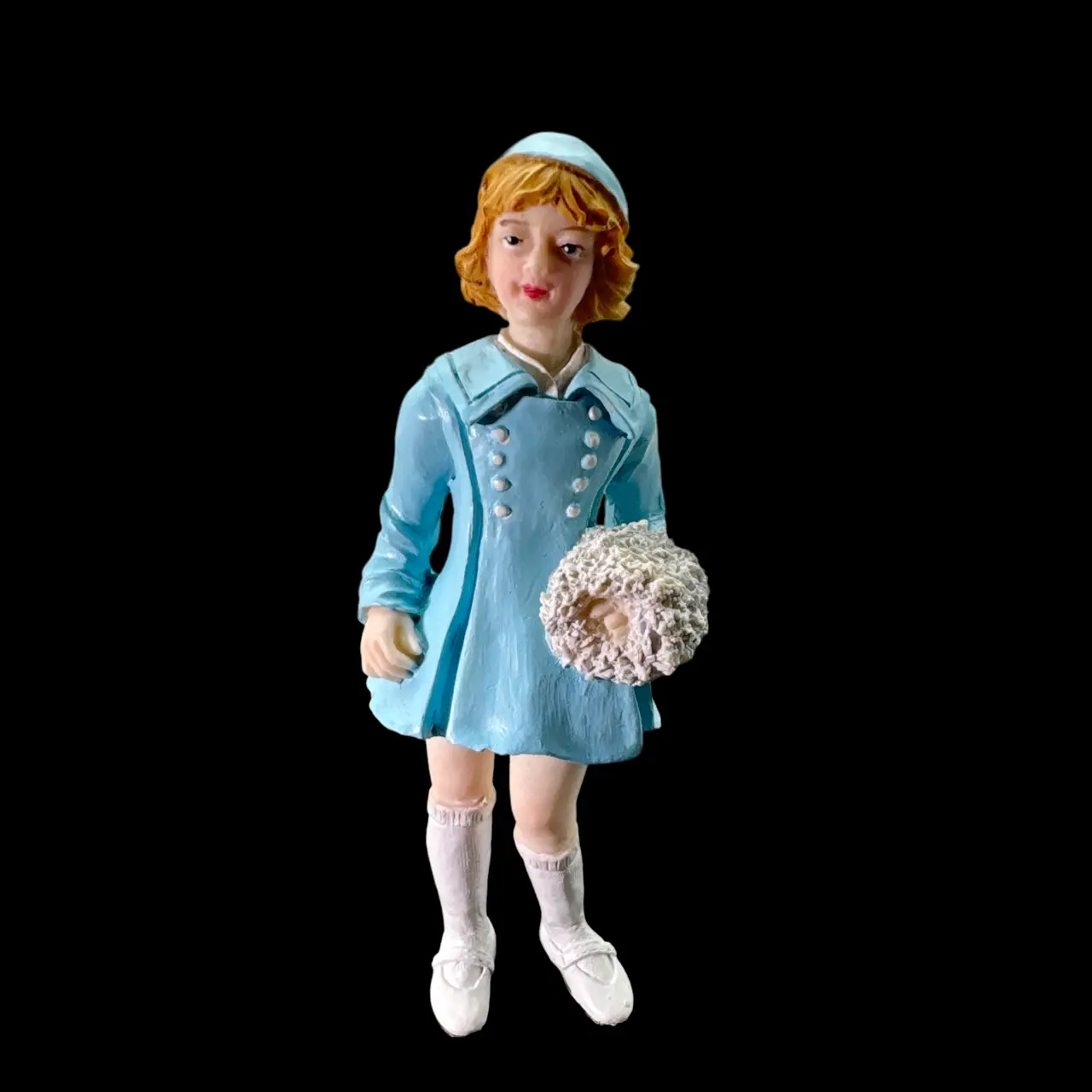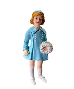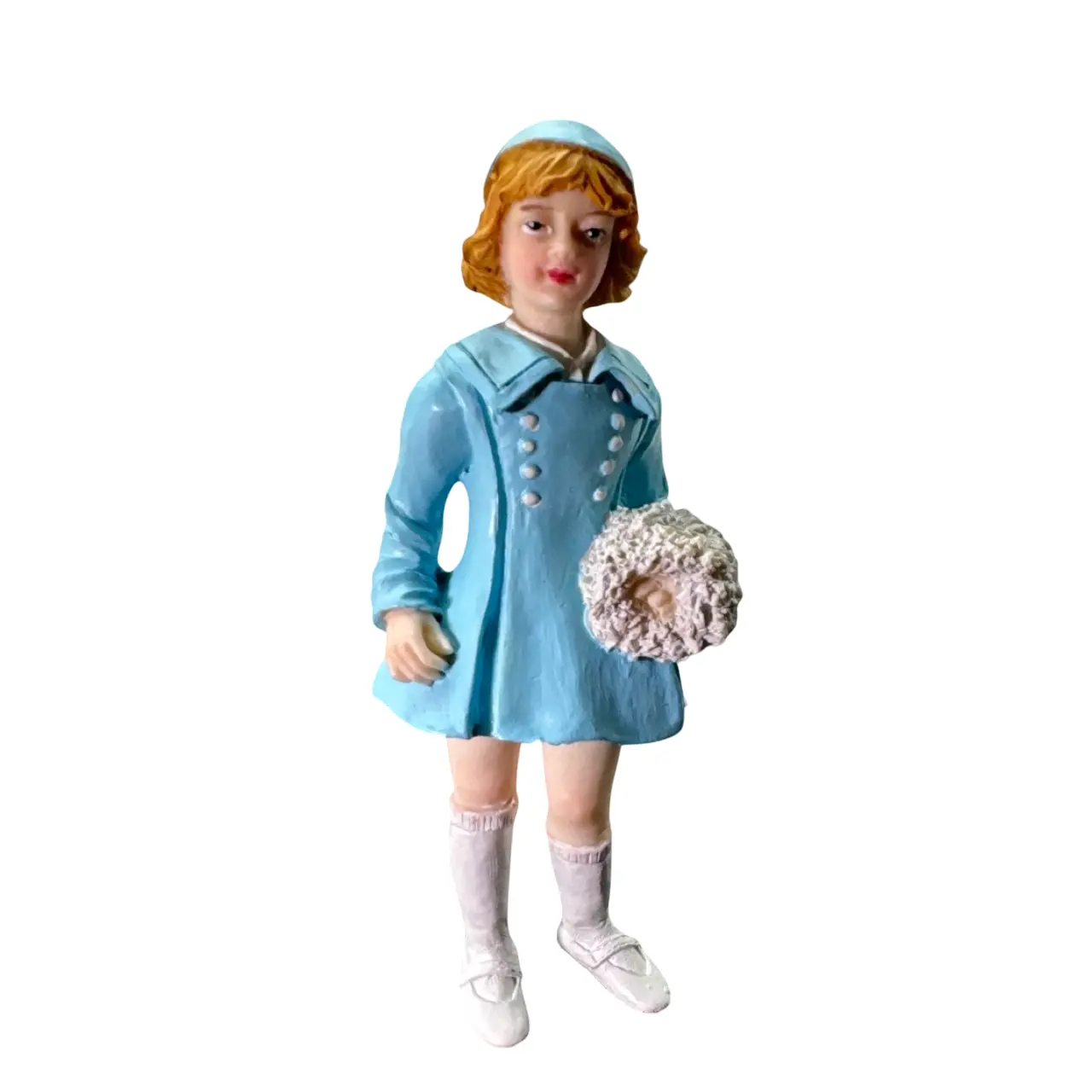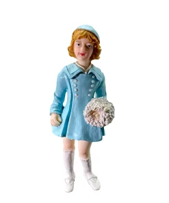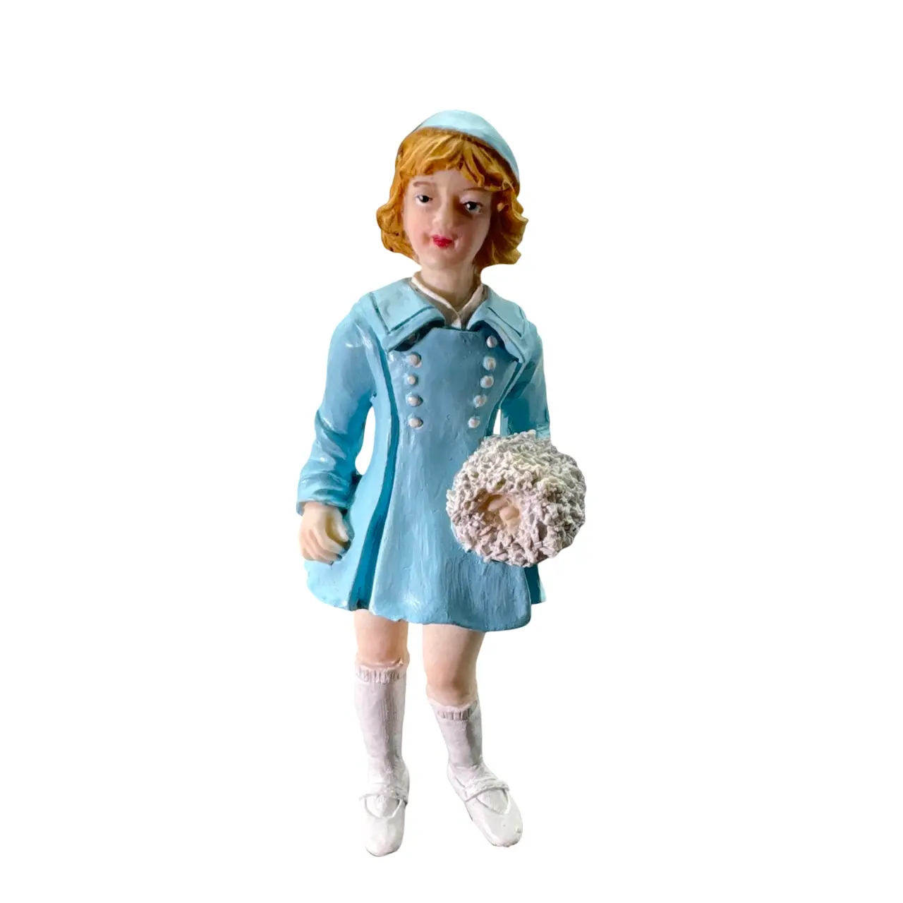 Modelée en résine peinte, la figurine présente une posture naturelle, un visage expressif et une robe bleue finement soulignée de boutons. Le bouquet texturé renforce l’effet de matière. La stabilité du socle autorise une mise en place rapide. Les proportions 1/12ᵉ respectées facilitent l’association avec fauteuils, commodes, tapis et luminaires miniatures, pour un rendu cohérent et immersif.