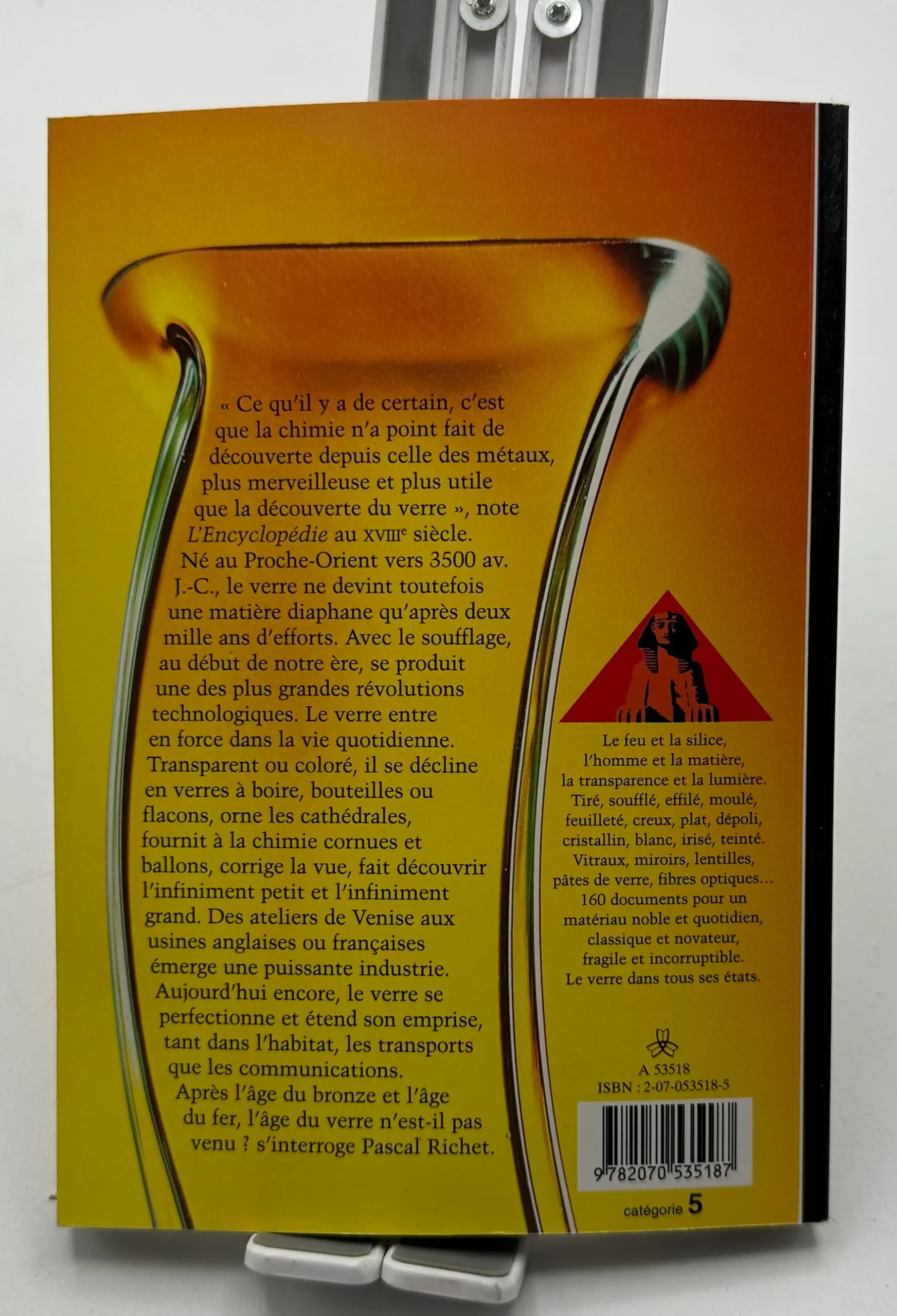 » Ce qu’il y a de certain, c’est que la chimie n’a point fait de découverte depuis celle des métaux plus merveilleuse et plus utile que la découverte du verre « , note L’Encyclopédie au XVIIIe siècle. Né au Proche-Orient vers 3500 av. J.-C., le verre ne devint toutefois une matière diaphane qu’après deux mille ans d’efforts. Avec le soufflage, au début de notre ère, se produit une des plus grandes révolutions technologiques. Le verre entre en force dans la vie quotidienne. Transparent ou coloré, il se décline en verres à boire, bouteilles ou flacons, orne les cathédrales, fournit à la chimie cornues et ballons, corrige la vue, fait découvrir l’infiniment petit et l’infiniment grand. Des ateliers de Venise aux usines anglaises ou françaises émerge une puissante industrie. Aujourd’hui encore, le verre se perfectionne et étend son emprise, tant dans l’habitat, les transports que les communications. Après l’âge du bronze et l’âge du fer, l’âge du verre n’est-il pas venu ? s’interroge Pascal Richet.