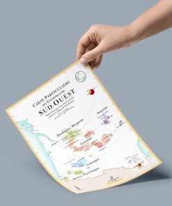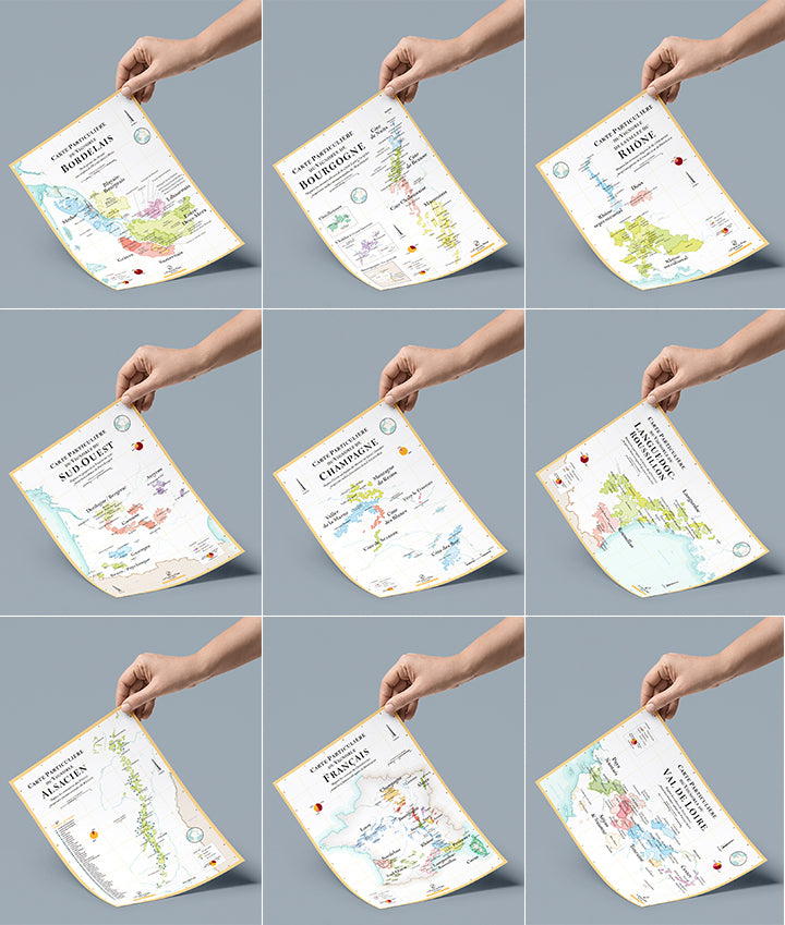 Voici un format plus adapté à la manipulation : ces cartes plastifiées (résistantes aux gouttes de vin) vous aident à rapidement vous repérer dans les vignobles français.