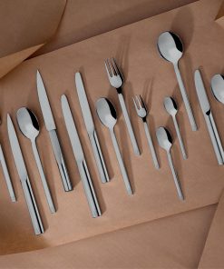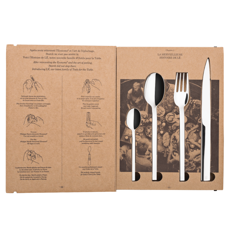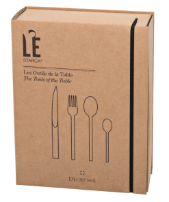 Avec leur profil épuré, rectiligne et résolument contemporain, la collection de couvert L’E signe la collaboration entre la maison DEGRENNE et le créateur PHILIPPE STARCK. Adaptées aux nouvelles tendances de consommation, les fourchettes sont dessinées dans une forme creusée pour savourer sauces, quinoa et autres céréales, tandis que les couteaux et leur manche ovale extrudé révèlent une face plane permettant de les poser sur la tranche. Réalisés dans un acier inoxydable 18-10 de haute qualité, ces couverts sont très résistants et apportent une véritable touche Design à vos tables. Le coffret 24 pièces L’E comprend 6 fourchettes de table, 6 couteaux de table, 6 cuillère de table et 6 cuillères à café.