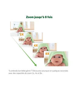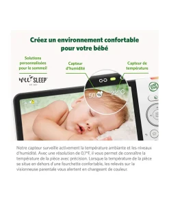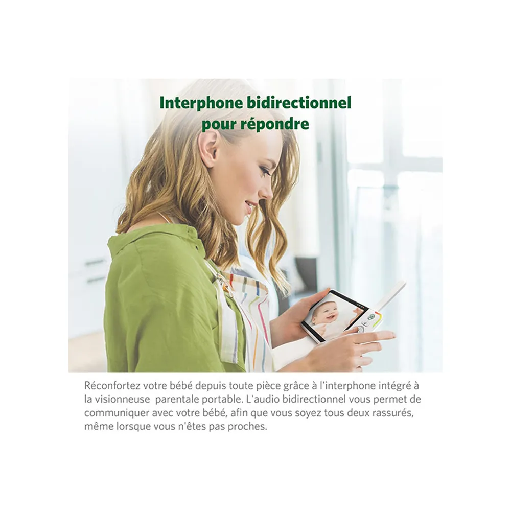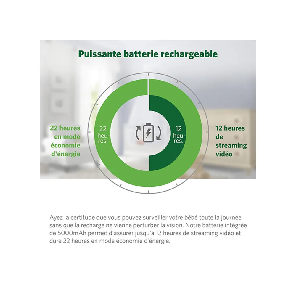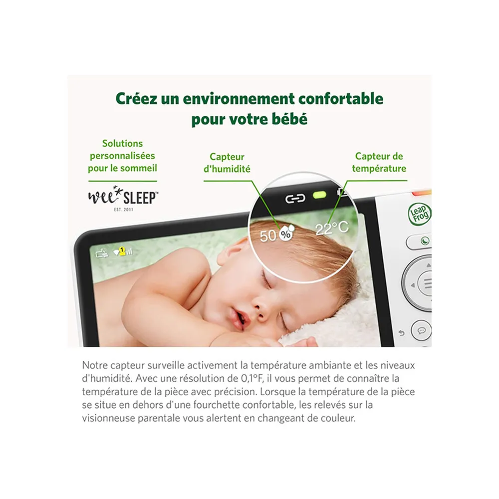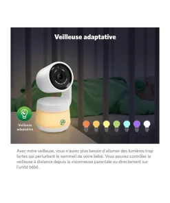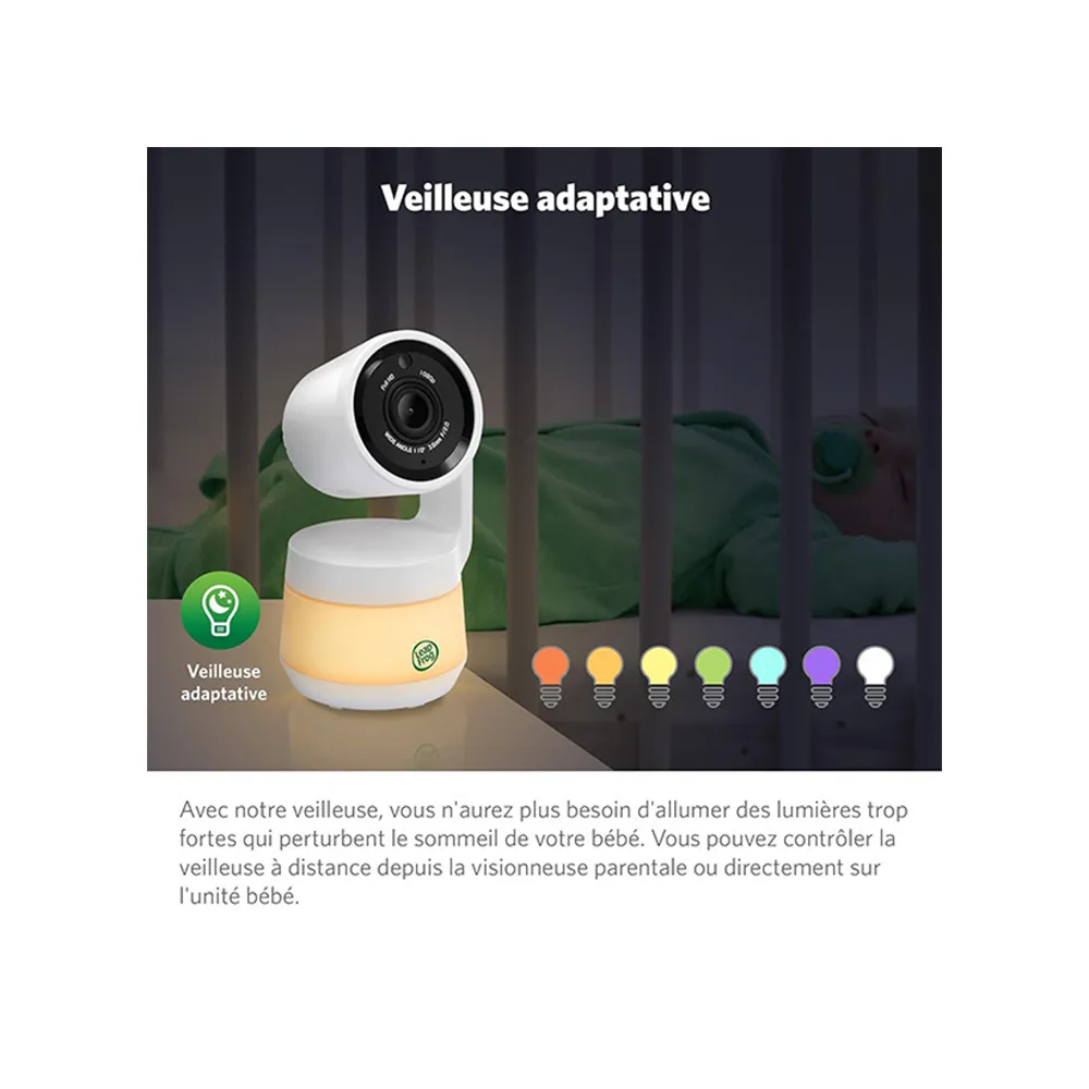 Obtenez une vue panoramique à 360 degrés et une vue jusqu’à 133 degrés vers le haut et vers le bas. Caméra de vision nocturne couleur .La technologie de vision nocturne avancée qui est supérieure à la technologie traditionnelle (noir et blanc) vous permet de voir clairement votre bébé en ultra-faible luminosité. Veilleuse marche/arrêt sur l’unité bébé. Une lumière apaisante sur l’unité bébé illumine doucement une pépinière sombre en cas de besoin. Astuces et conseils professionnels gratuits dans l’application. Un contenu et des vidéos riches fournis par les experts de WeeSleep et LeapFrog fournissent des astuces et des conseils utiles sur le sommeil, les relations sociales, la cognition et bien plus encore pour aider à la croissance et au développement de votre bébé.