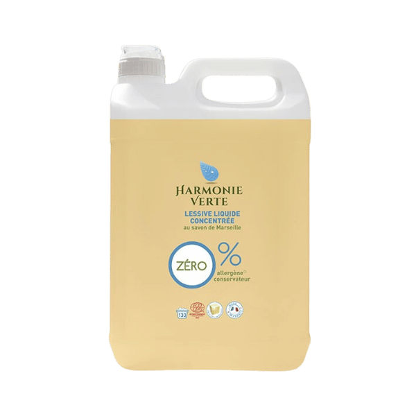Découvrez la lessive liquide Harmonie Verte au savon de Marseille, un produit écologique et doux pour votre linge et l’environnement. Avec son format généreux de 5L, elle allie efficacité, respect des fibres textiles et authenticité grâce à sa formule naturelle sans allergènes*. Certifiée par Ecocert, elle convient pour tous types de textiles, même les plus délicats, et s’utilise à basse température. Optez pour une propreté impeccable tout en préservant la planète !