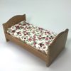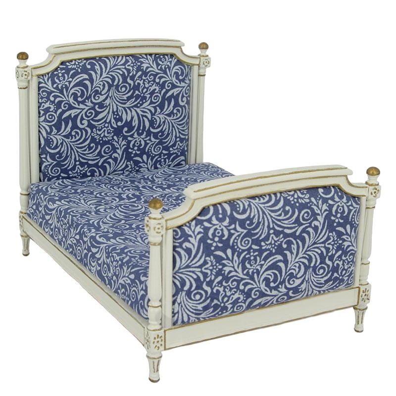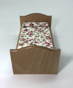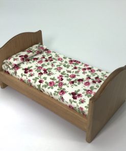 Fabriqué en bois massif, ce lit double est peint en ivoire souligné de jolis filets dorés. Le matelas amovible est recouvert d’un tissu floral bleu identique à la structure en bois du lit. Mesurant 17,15 cm de long, 12 cm de large et 12,25 cm de hauteur, cette pièce imposante reste proportionnée pour une maison de poupée à l’échelle 1:12. De plus, les détails sculptés et les ornements dorés ajoutent une touche d’authenticité et de réalisme.