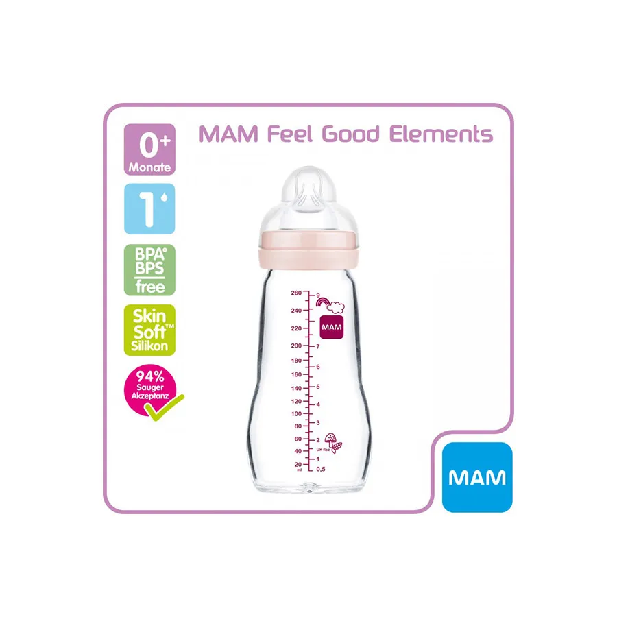 Le biberon en verre incassable MAM Feel Good Element est doté d’une grande ouverture, ce qui le rend facile à nettoyer et à remplir.