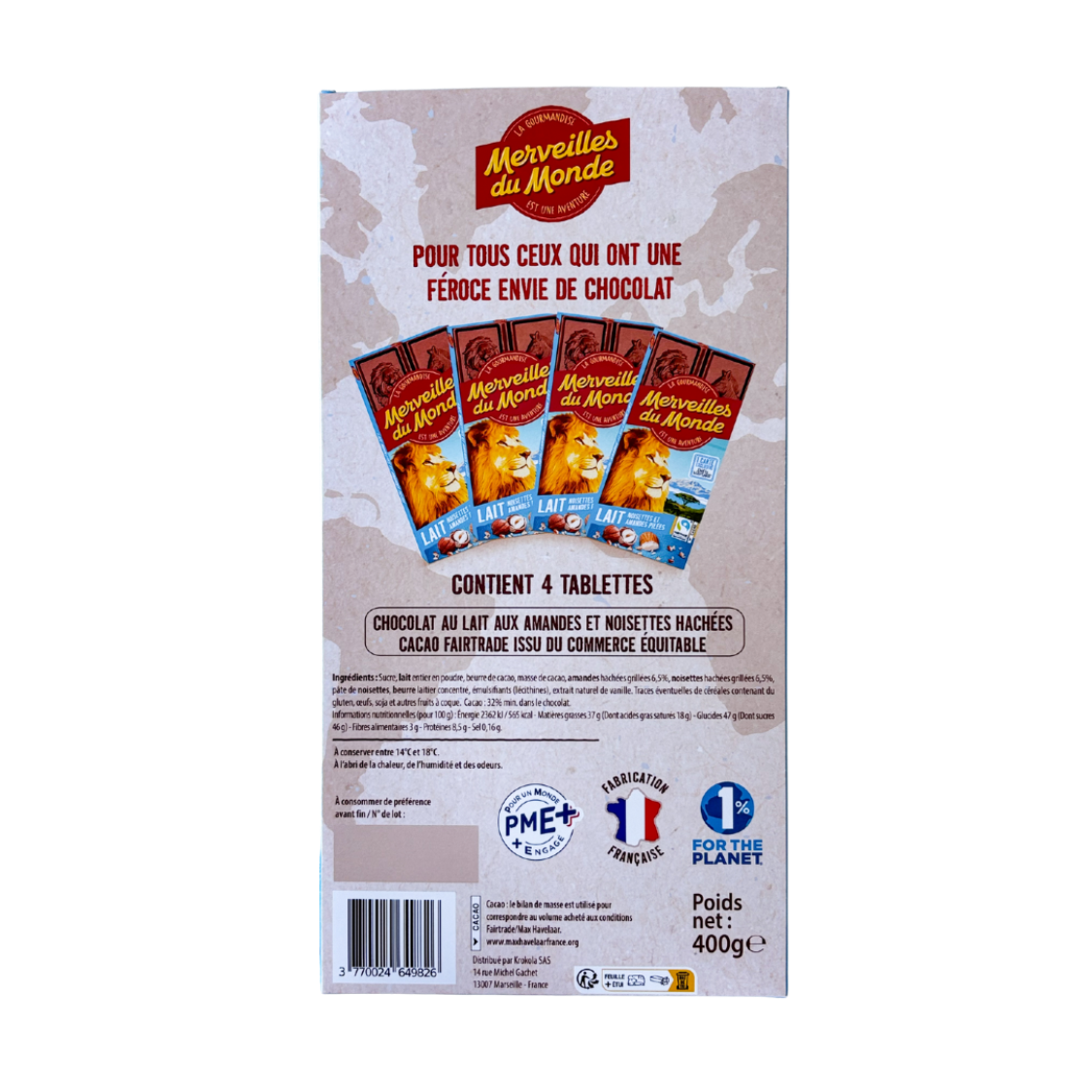 Découvrez la Maxi Tablette Merveilles du Monde, un coffret gourmand composé de quatre tablettes iconique Merveilles du Monde au chocolat au lait, noisettes et amandes pilées, à partager (ou pas !). Chaque carreau est une invitation à la gourmandise, avec un chocolat au lait onctueux et des noisettes et amandes croquantes. Ce coffret est l’allié parfait pour les moments de partage en famille ou entre amis, ou pour une petite pause sucrée en solo. Cette maxi tablette est aussi le cadeau idéal à offrir à tous les aventuriers gourmands ! Alors, laissez-vous emporter par cette explosion de saveurs et goûtez à la magie de Merveilles du Monde. Parce que le chocolat, c’est encore mieux en version maxi !
